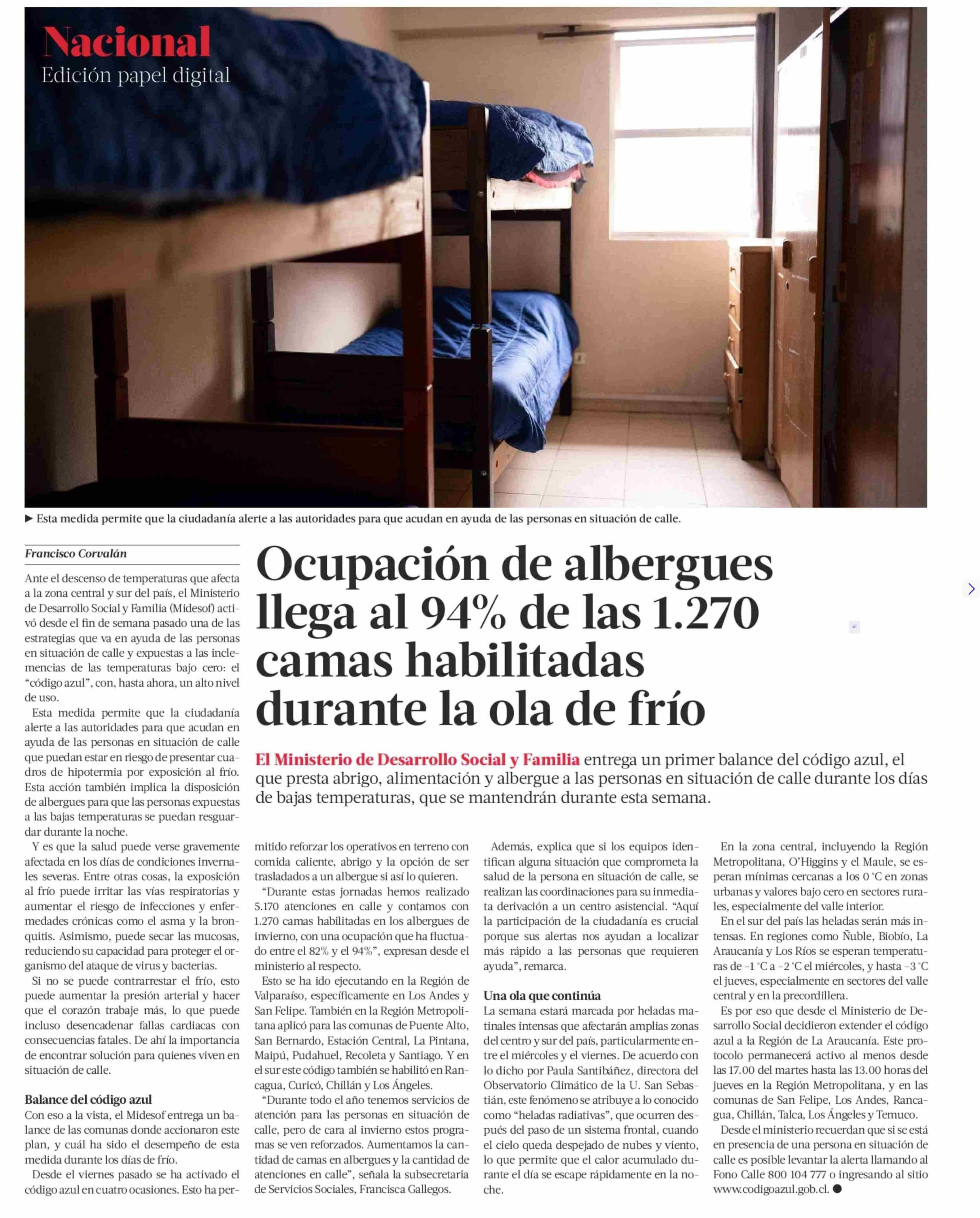 Ocupación de albergues llega al 94% de las 1.270 camas habilitadas durante la ola de frío