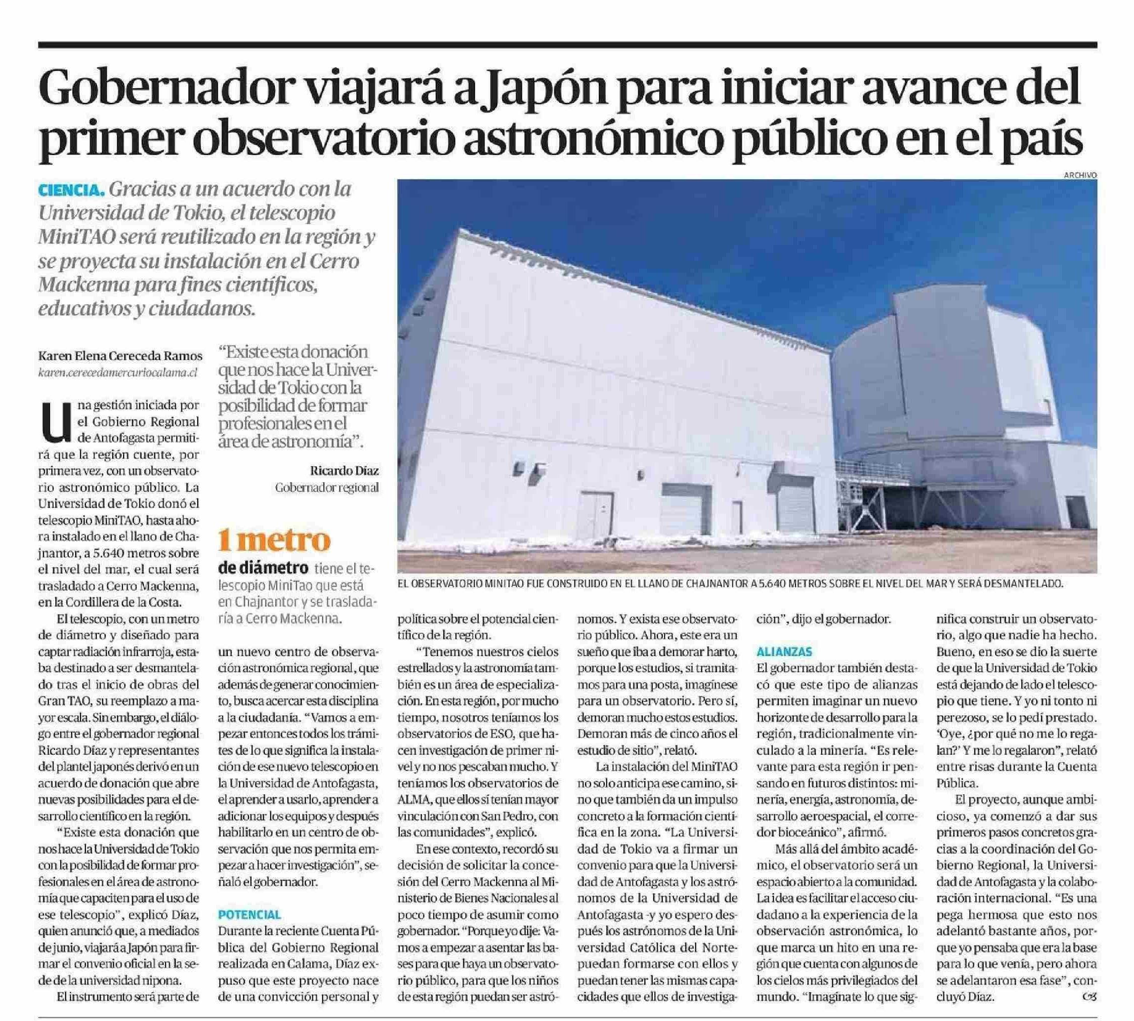 Gobernador viajará a Japón para iniciar avance del primer observatorio astronómico público en el país