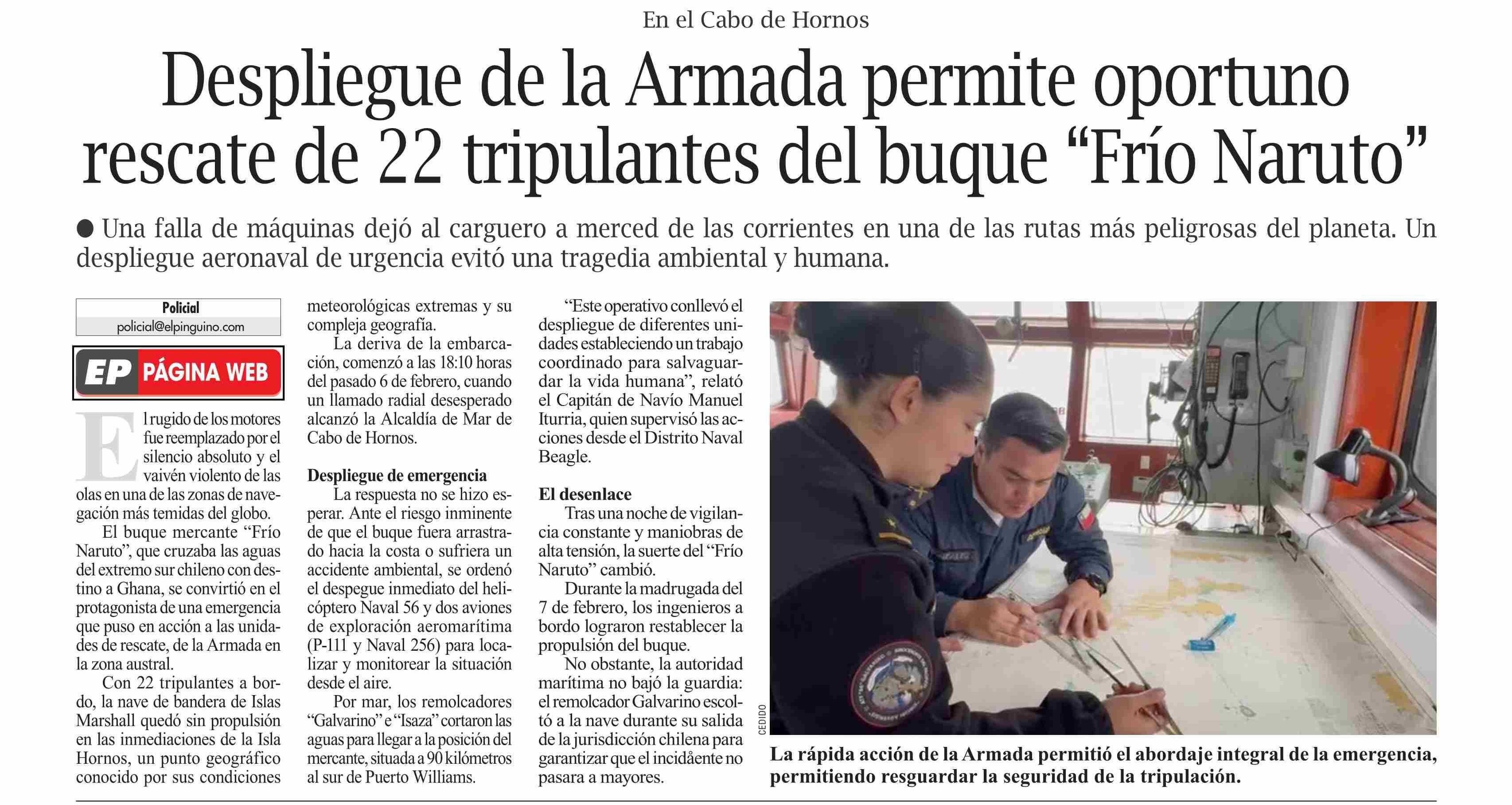 Despliegue de la Armada permite oportuno rescate de 22 tripulantes del buque “Frío Naruto”