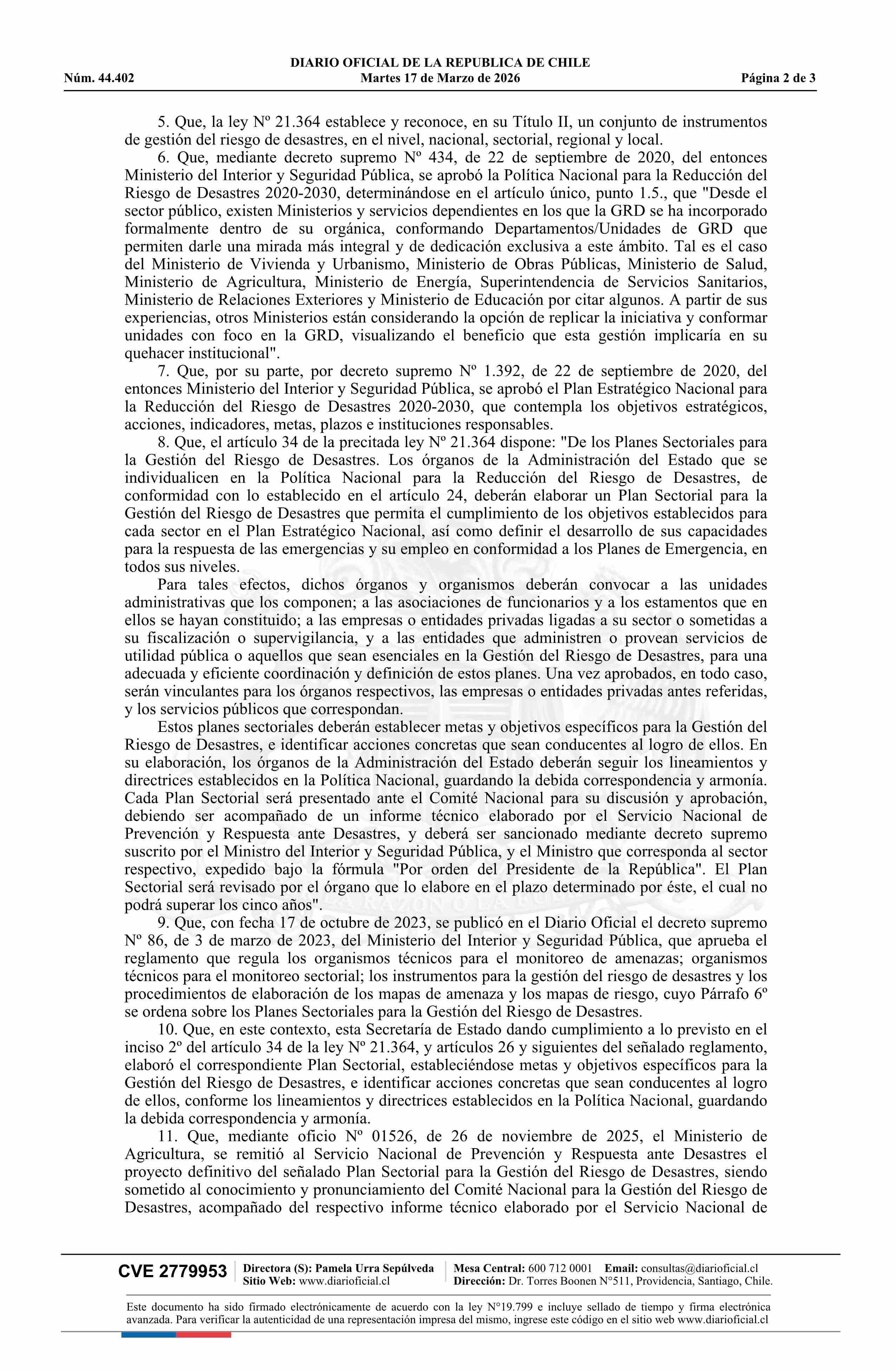 | Título: | Decreto exento número 12, de 2026.- Aprueba Plan Sectorial para la Gestión del Riesgo de Desastres |