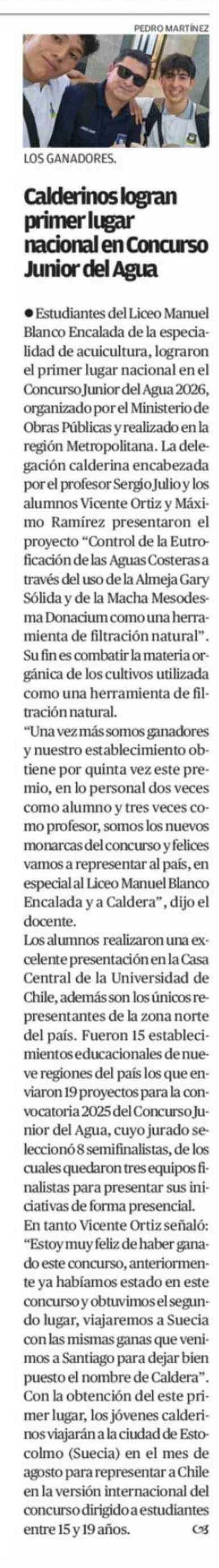 Calderinos logran primer lugar nacional en Concurso Junior del Agua