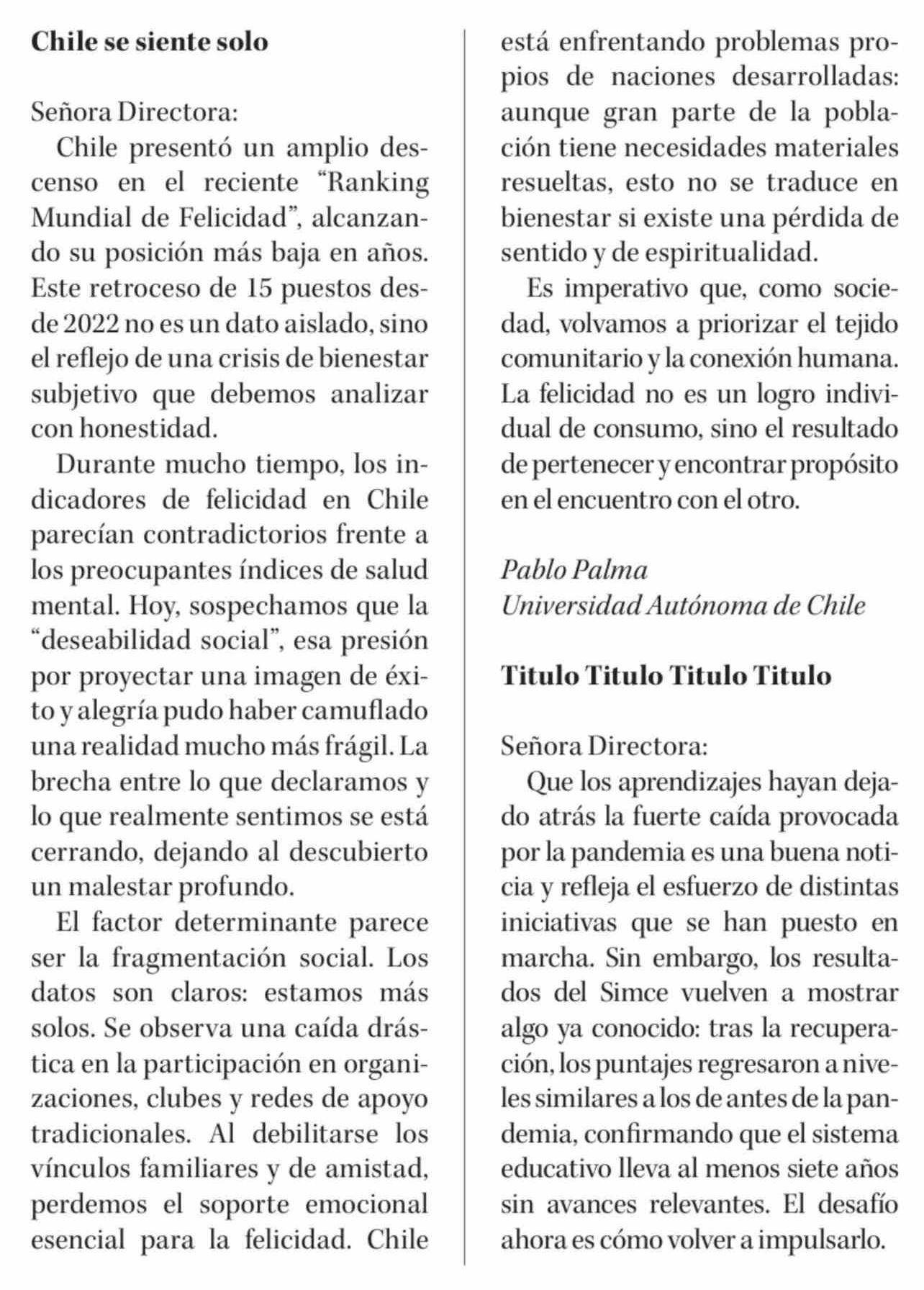 Cartas: Chile se siente solo