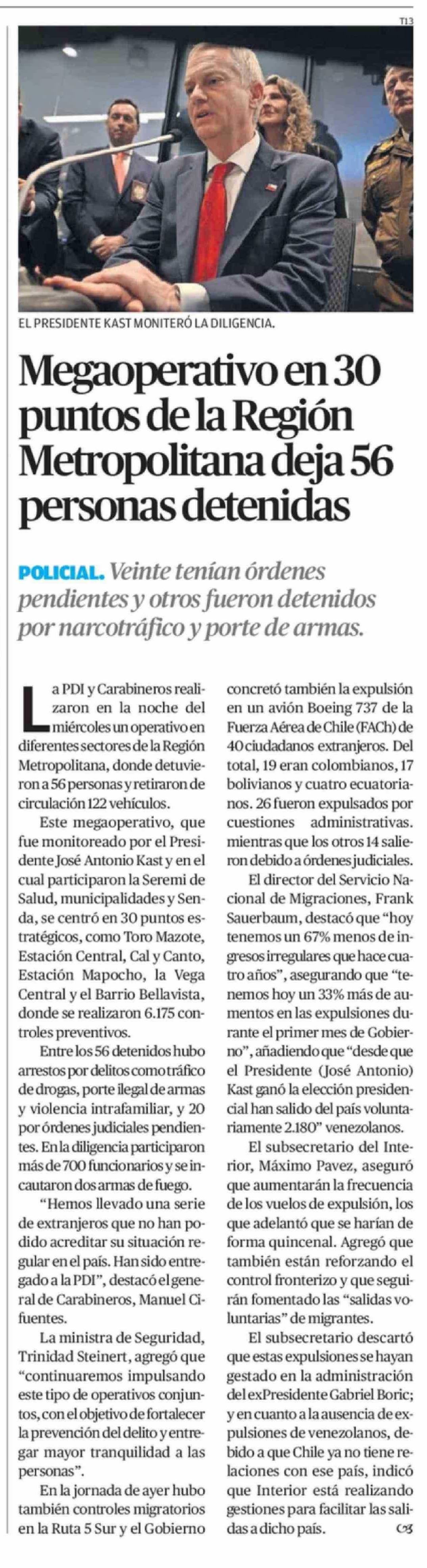 Megaoperativo en 30 puntos de la Región Metropolitana deja 56 personas detenidas