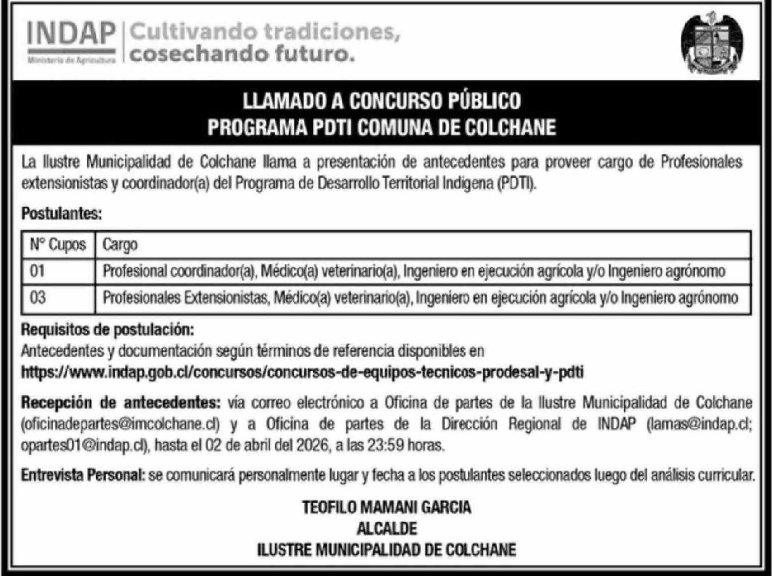 Título: Aviso Licitaciones: La Ilustre Municipalidad de Colchane llama a presentación de antecedentes para proveer cargo de Profesionales extensionistas y coordinador(a) del Programa de Desarrollo Territorial Indigena (PDTI). Postulantes: Nº Cupos Cargo 01 Profesional coordinador(a), Médico(a) veterinario(a