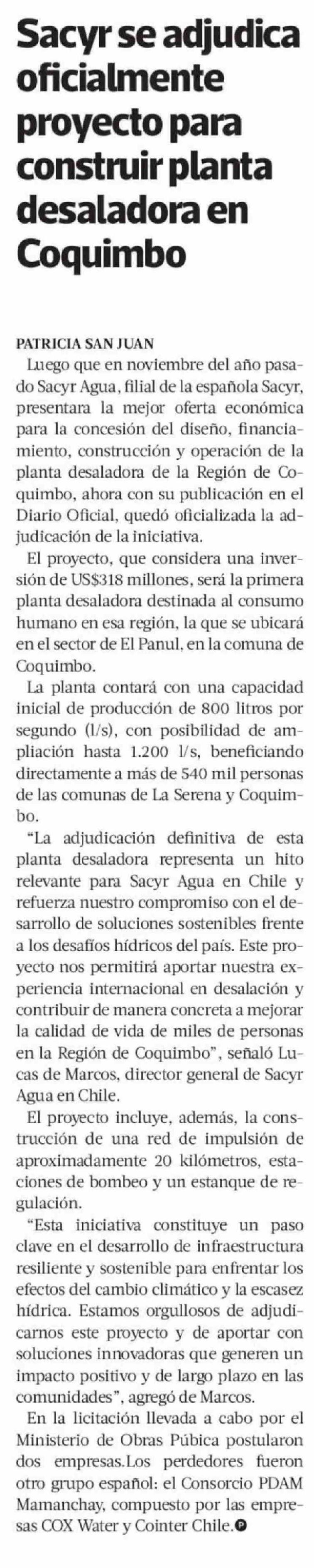 Sacyr se adjudica oficialmente proyecto para construir planta desaladora en Coquimbo