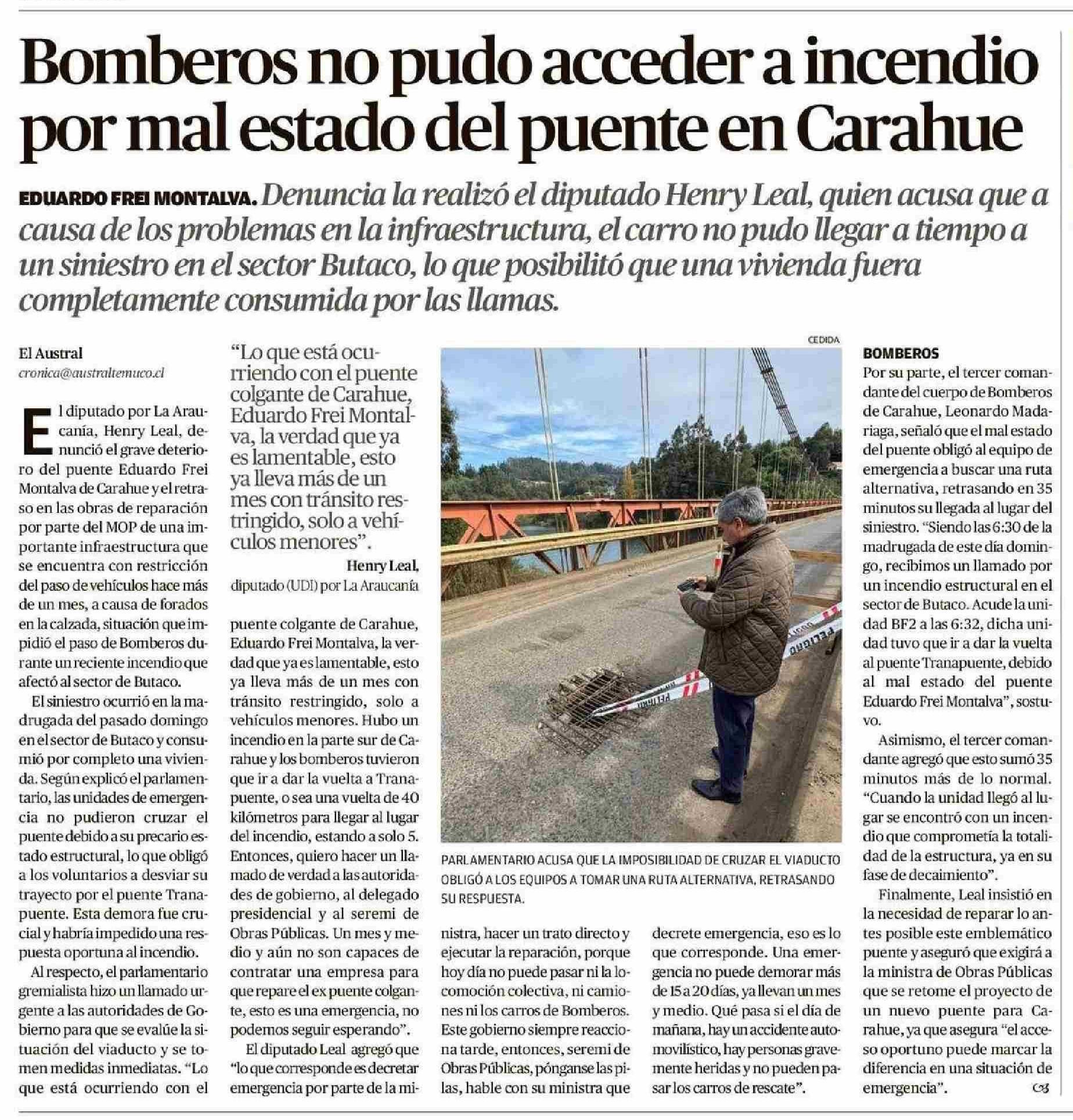 Bomberos no pudo acceder a incendio por mal estado del puente en Carahue