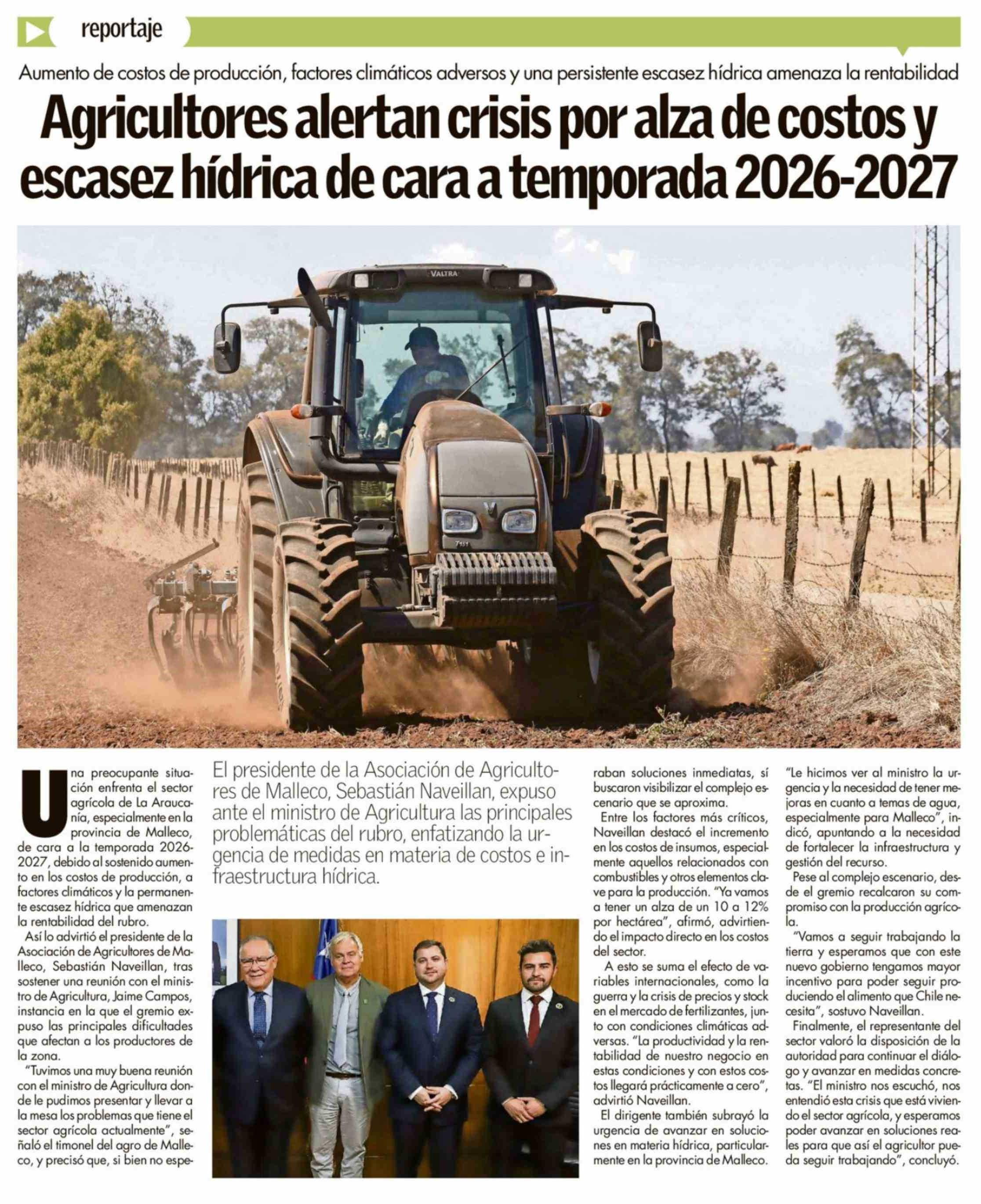 Agricultores alertan crisis por alza de costos y escasez hídrica de cara a temporada 2026-2027