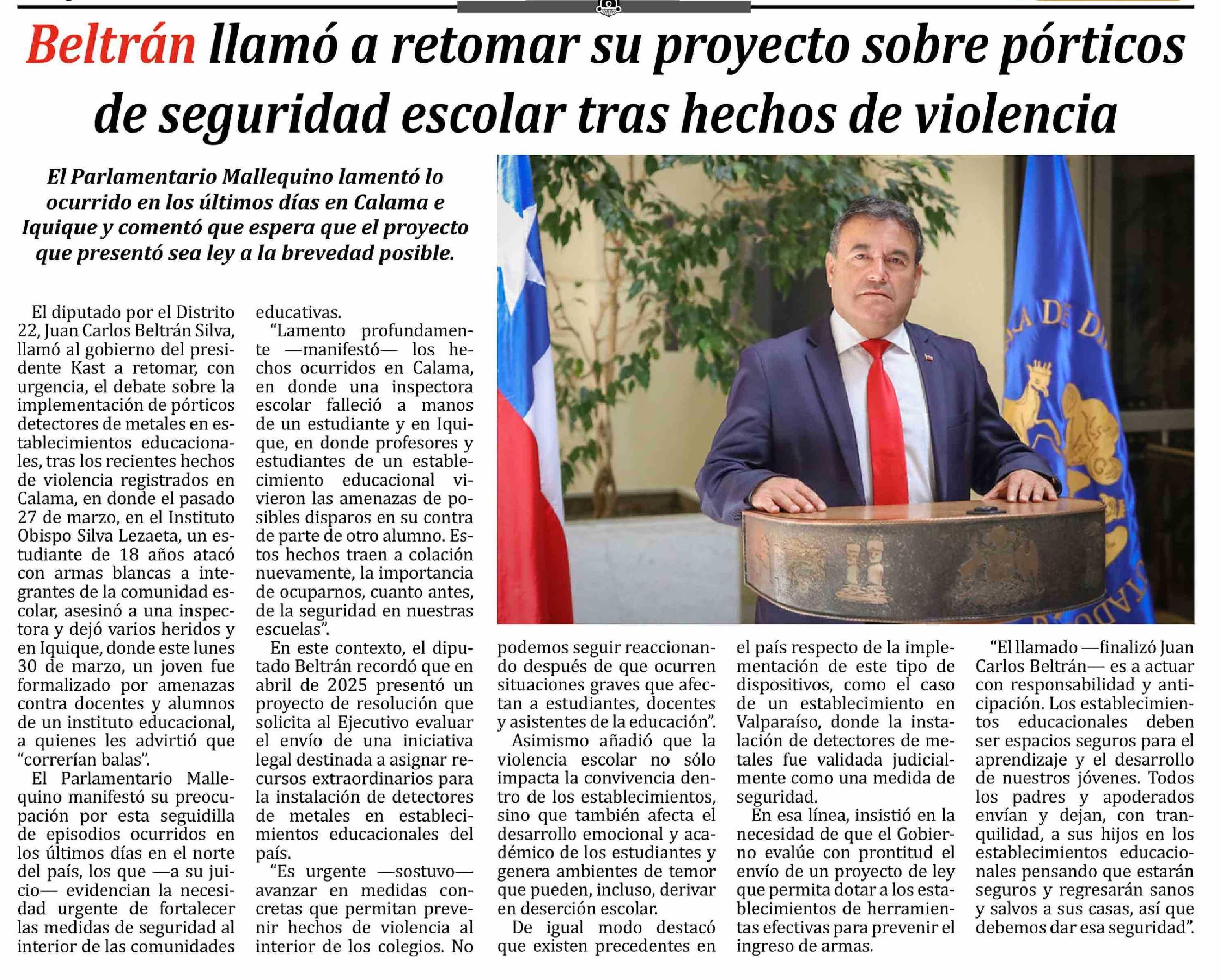 Beltrán llamó a retomar su proyecto sobre pórticos de seguridad escolar tras hechos de violencia