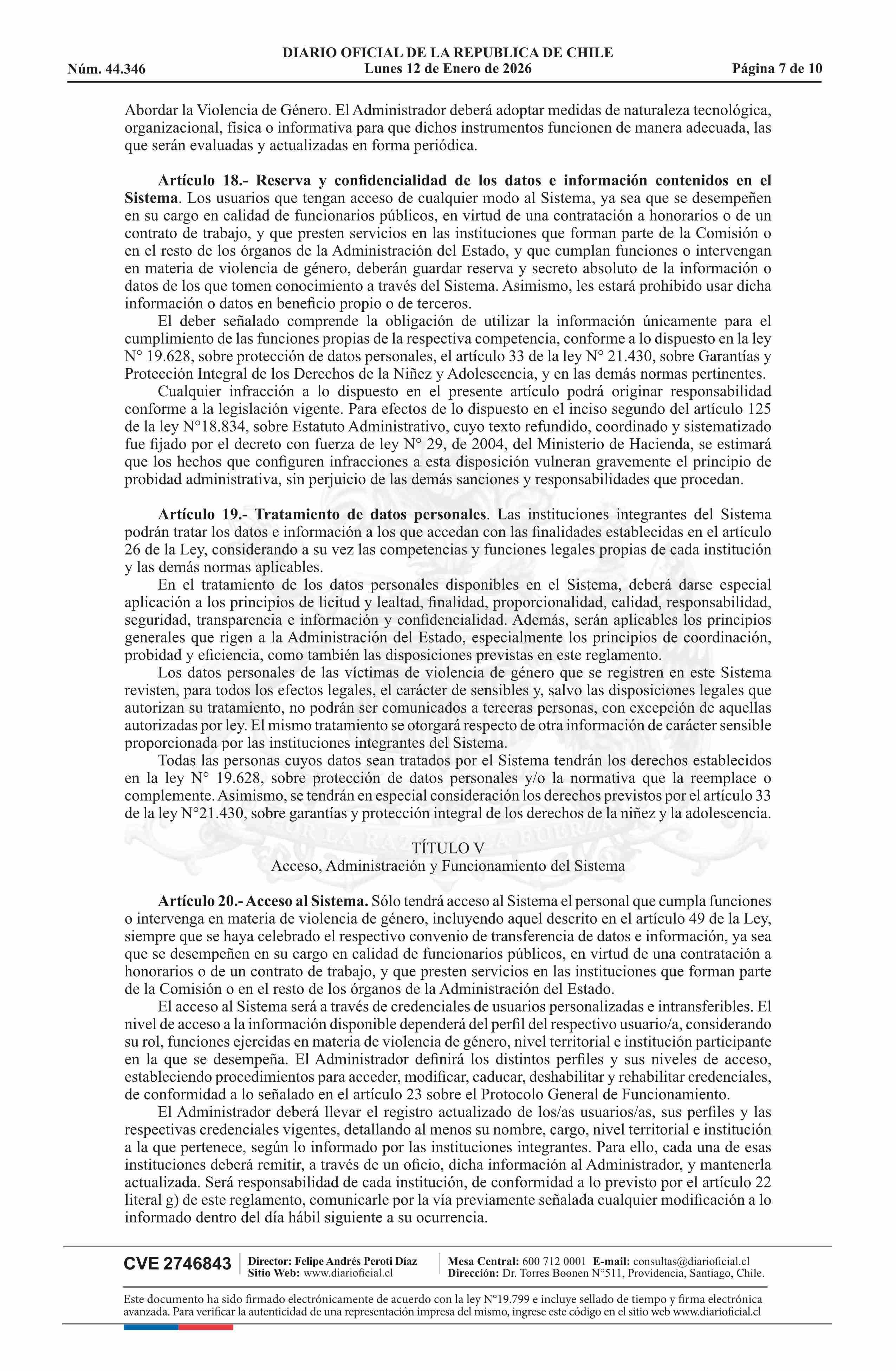 | Título: | Decreto número 18, de 2025.- Aprueba Reglamento que regula el Sistema Integrado de Información sobre Violencia de Género, según lo dispuesto en el artículo 26 de la ley N° 21.675 |