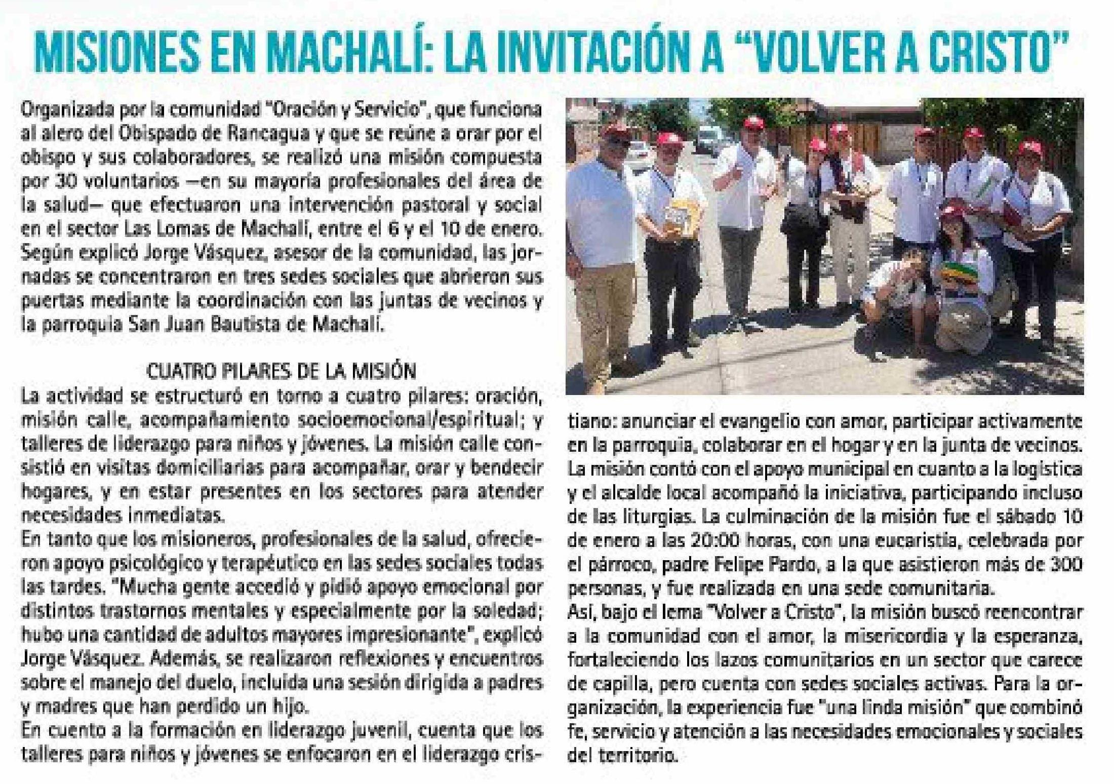 Título: Organizada por la comunidad "Oración y Servicio", que funciona al alero del Obispado de Rancagua y que se reúne a orar por el obispo y sus colaboradores, se realizo una misión compuesta por 30 voluntarios -en su mayoría profesionales del área de la salud- que efectuaron una intervención pastoral y s