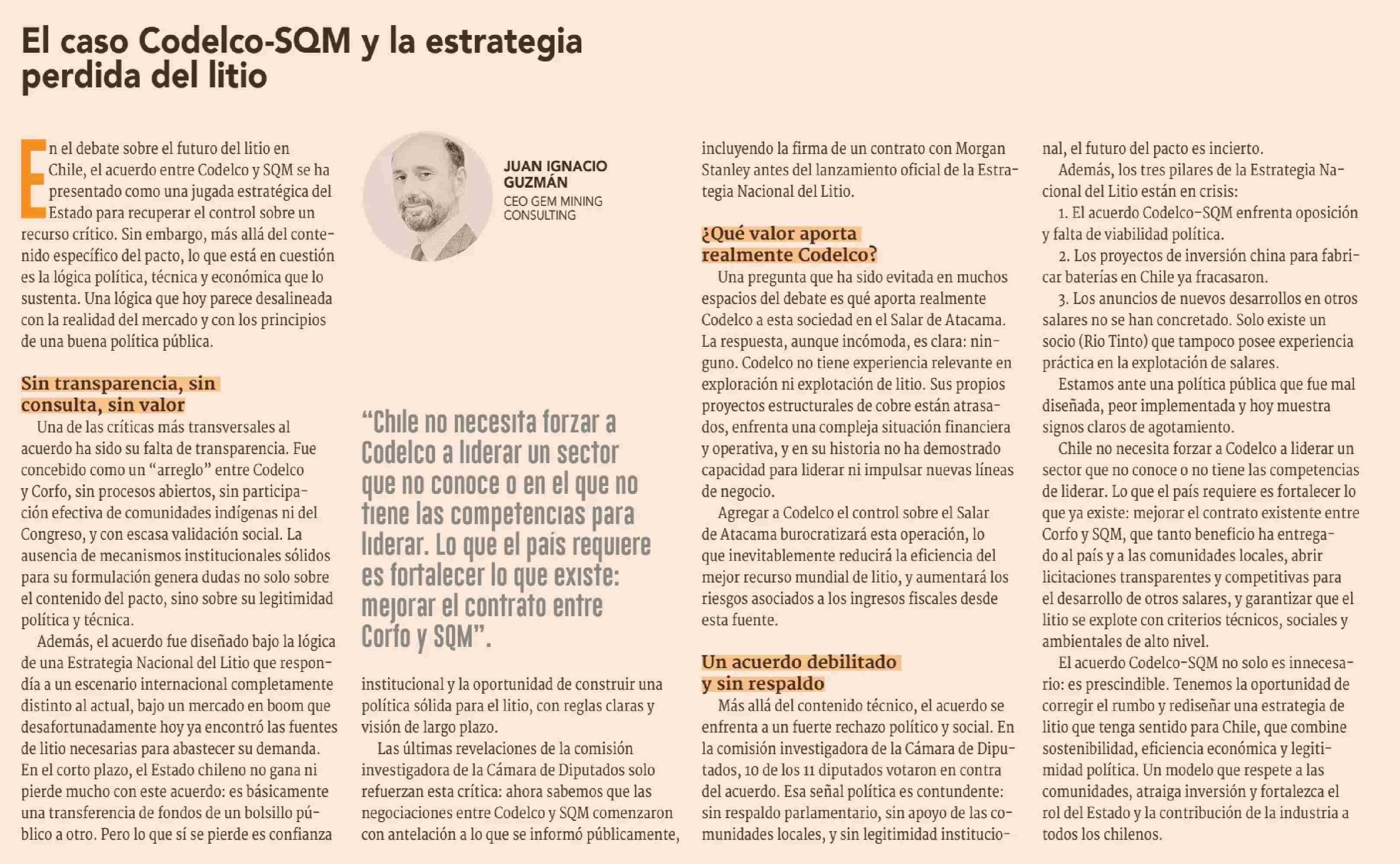 COLUMNAS DE OPINIÓN: El caso Codelco-SQM y la estrategia perdida del litio