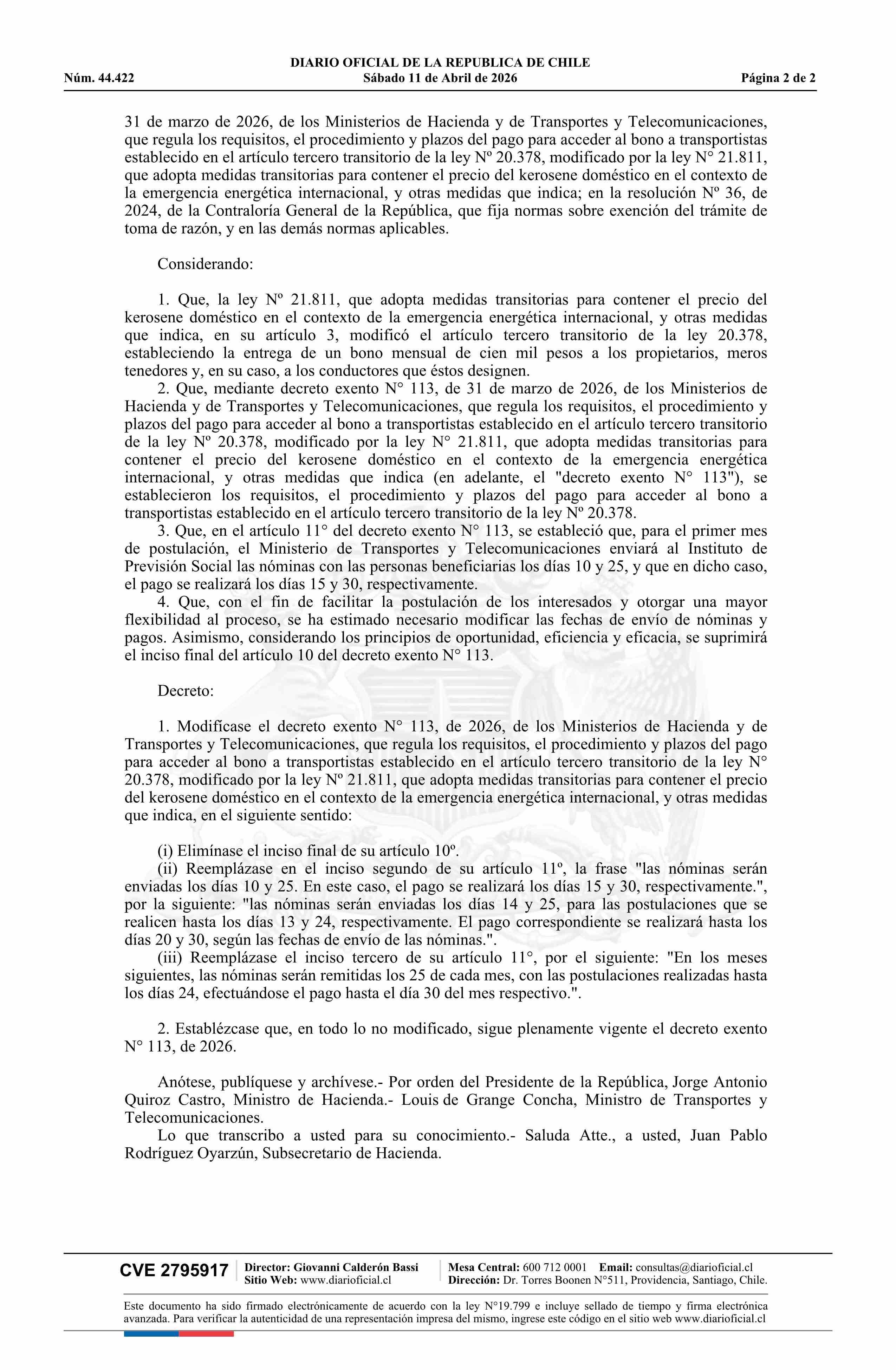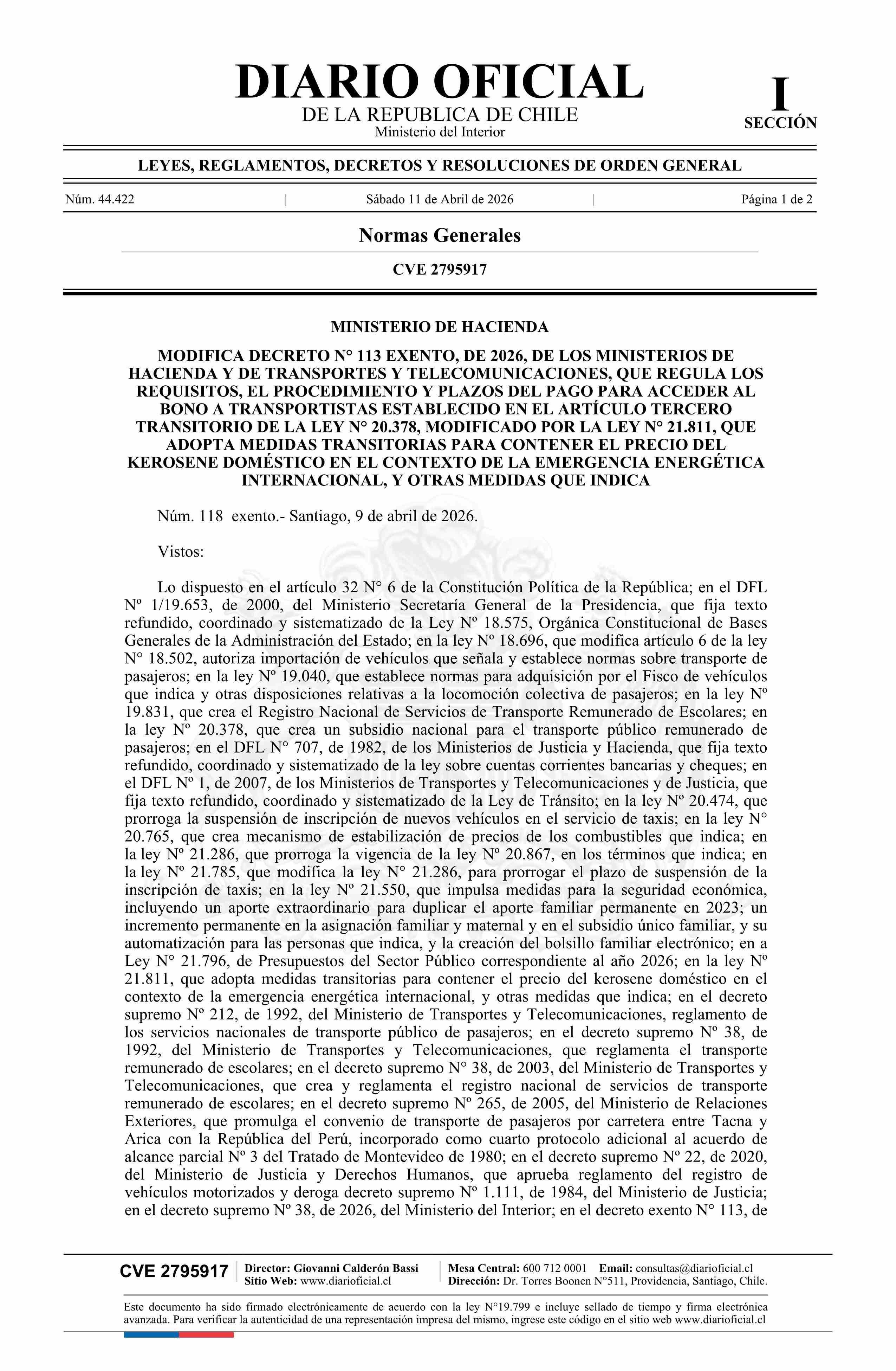 | Título: | Decreto exento número 118, de 2026.- Modifica decreto N° 113 exento, de 2026, de los Ministerios de Hacienda y de Transportes y Telecomunicaciones, que regula los requisitos, el procedimiento y plazos del pago para acceder al bono a transportistas establecido en el artículo tercero transitorio de la |