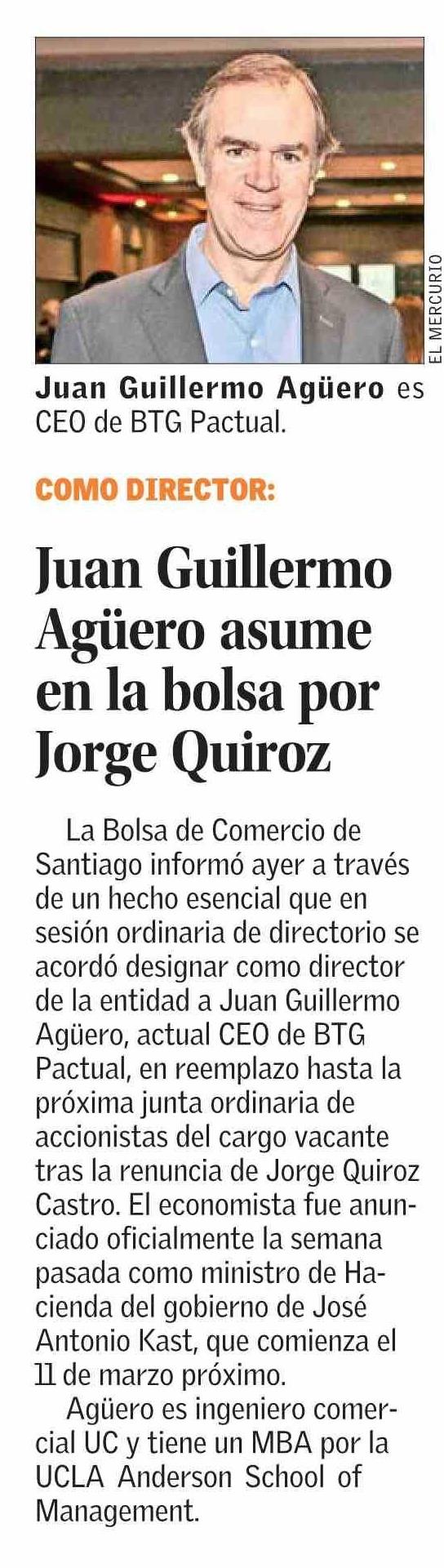 Juan Guillermo Agüero asume en la bolsa por Jorge Quiroz