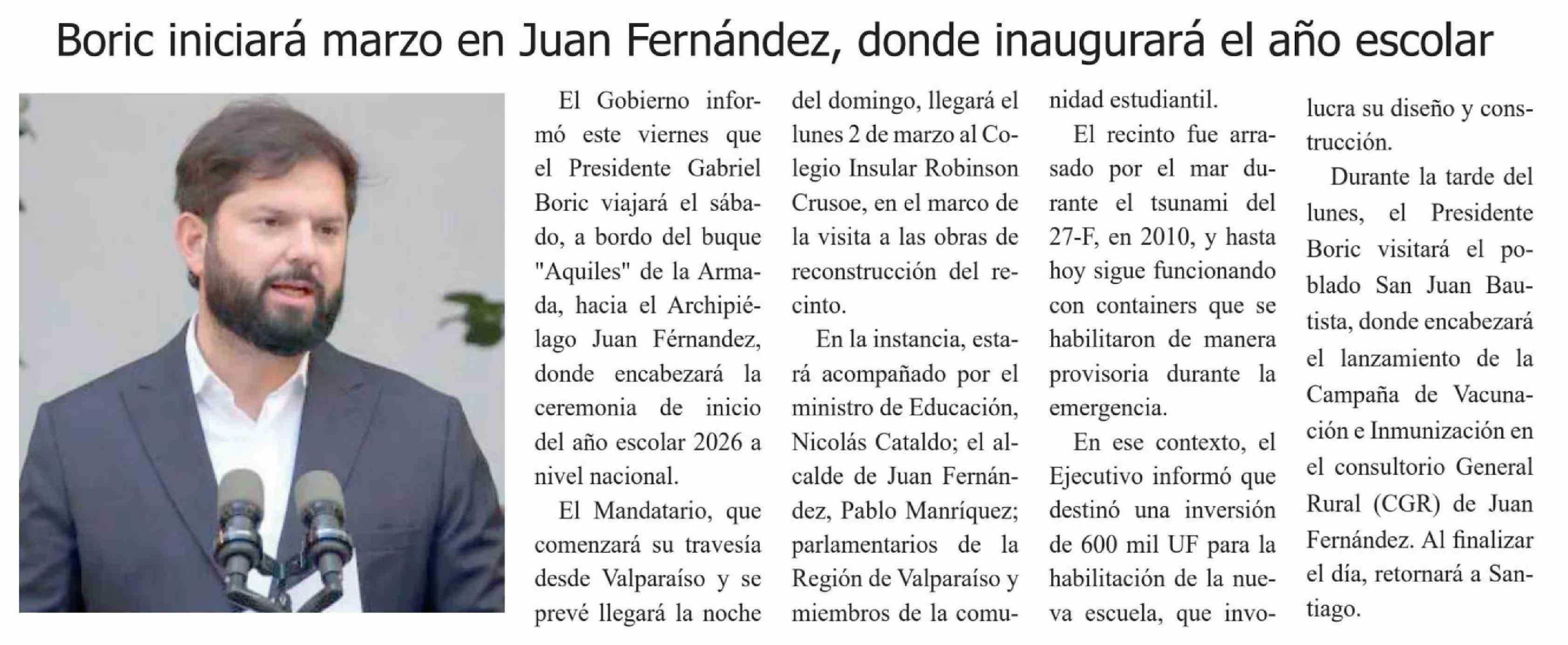 Título: Boric iniciará marzo en Juan Fernández, donde inaugurará el año escolar