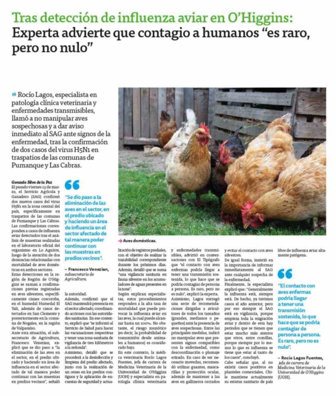 Tras detección de influenza aviar en O'Higgins: Experta advierte que contagio a humanos "es raro, pero no nulo"