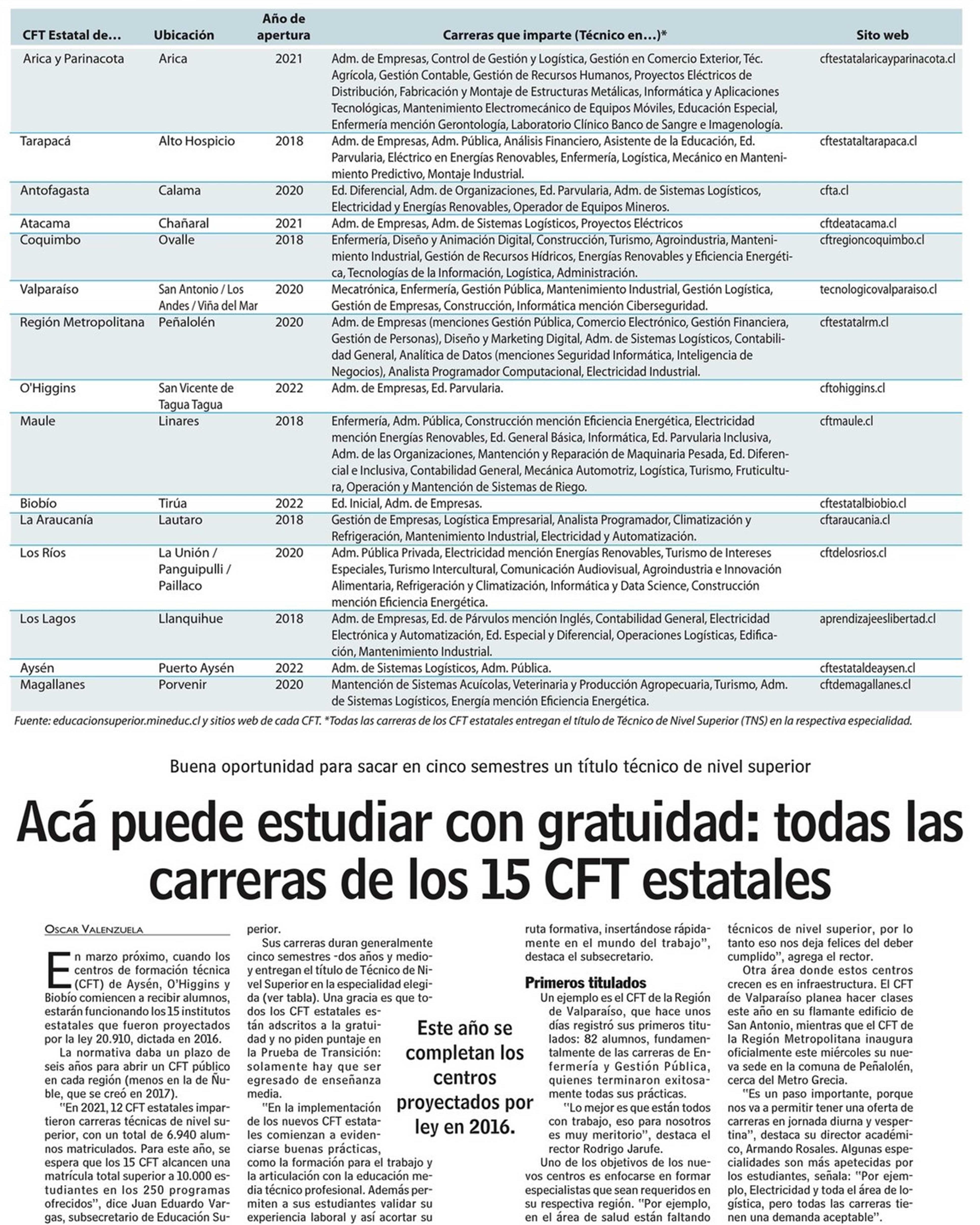 Acá puede estudiar con gratuidad: todas las carreras de los 15 CFT estatales