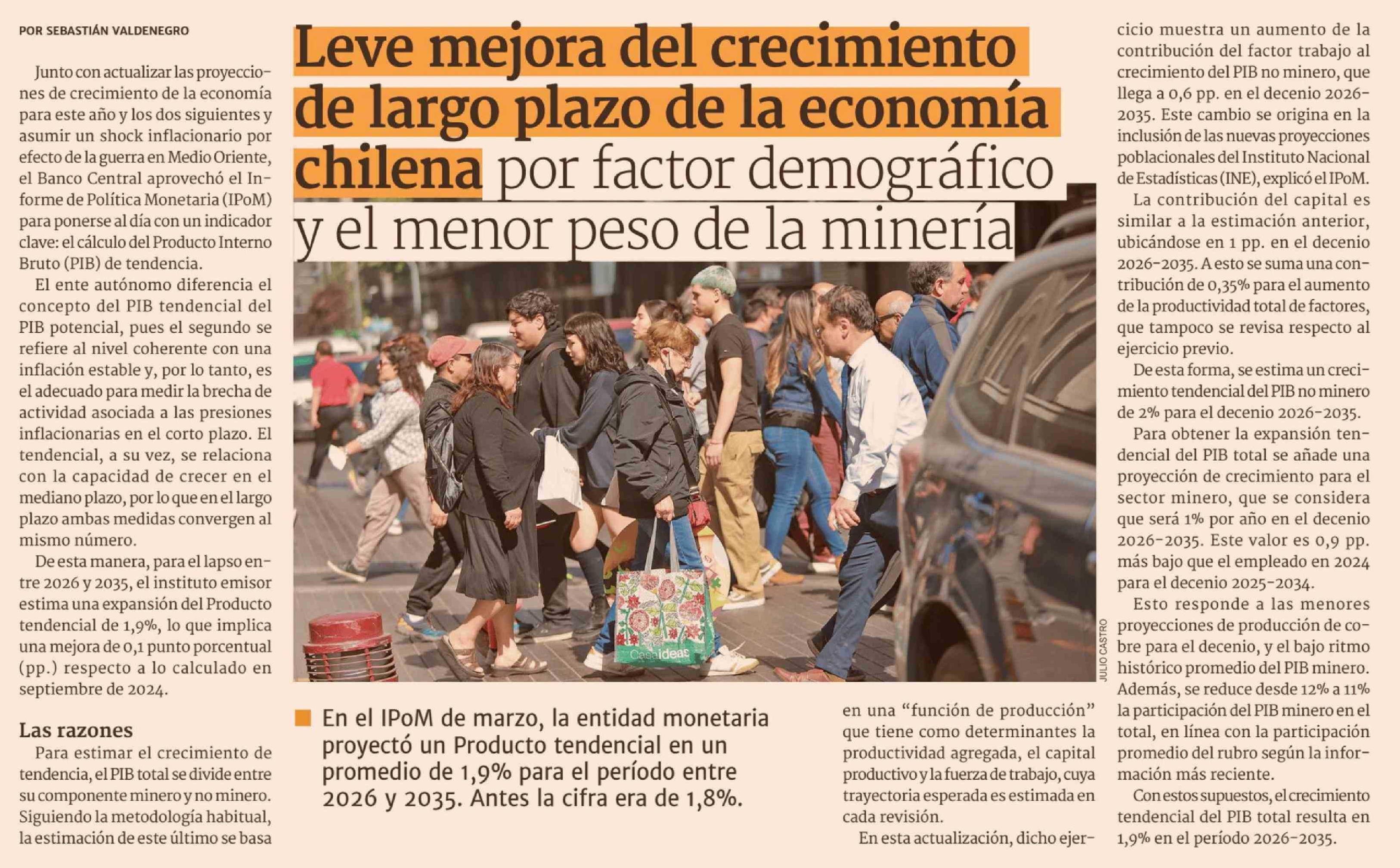 Leve mejora del crecimiento de largo plazo de la economía chilena por factor demográfico y el menor peso de la minería