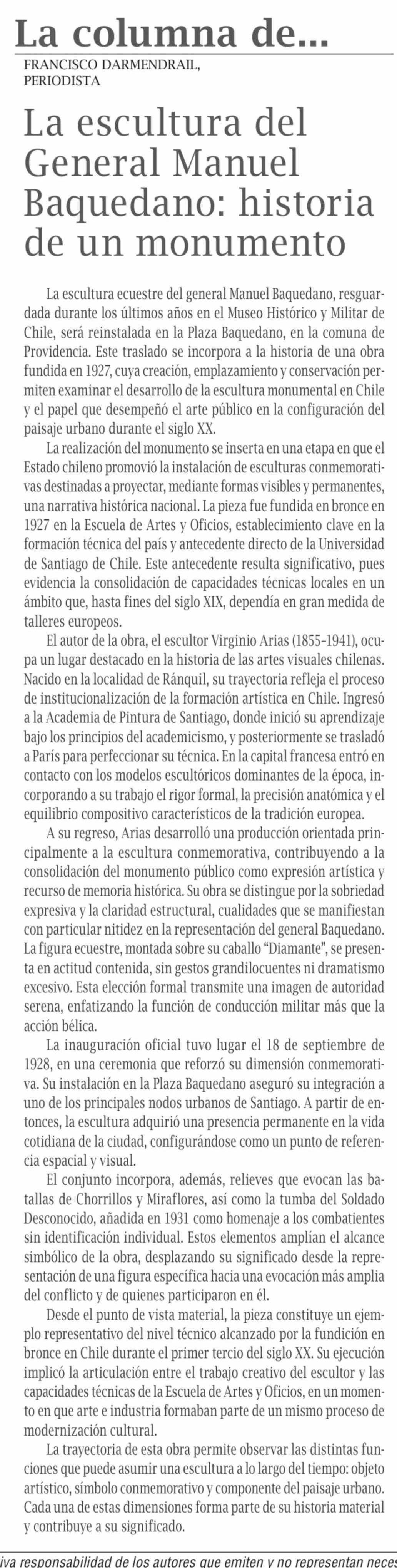 Columnas de Opinión: La escultura del General Manuel Baquedano: historia de un monumento