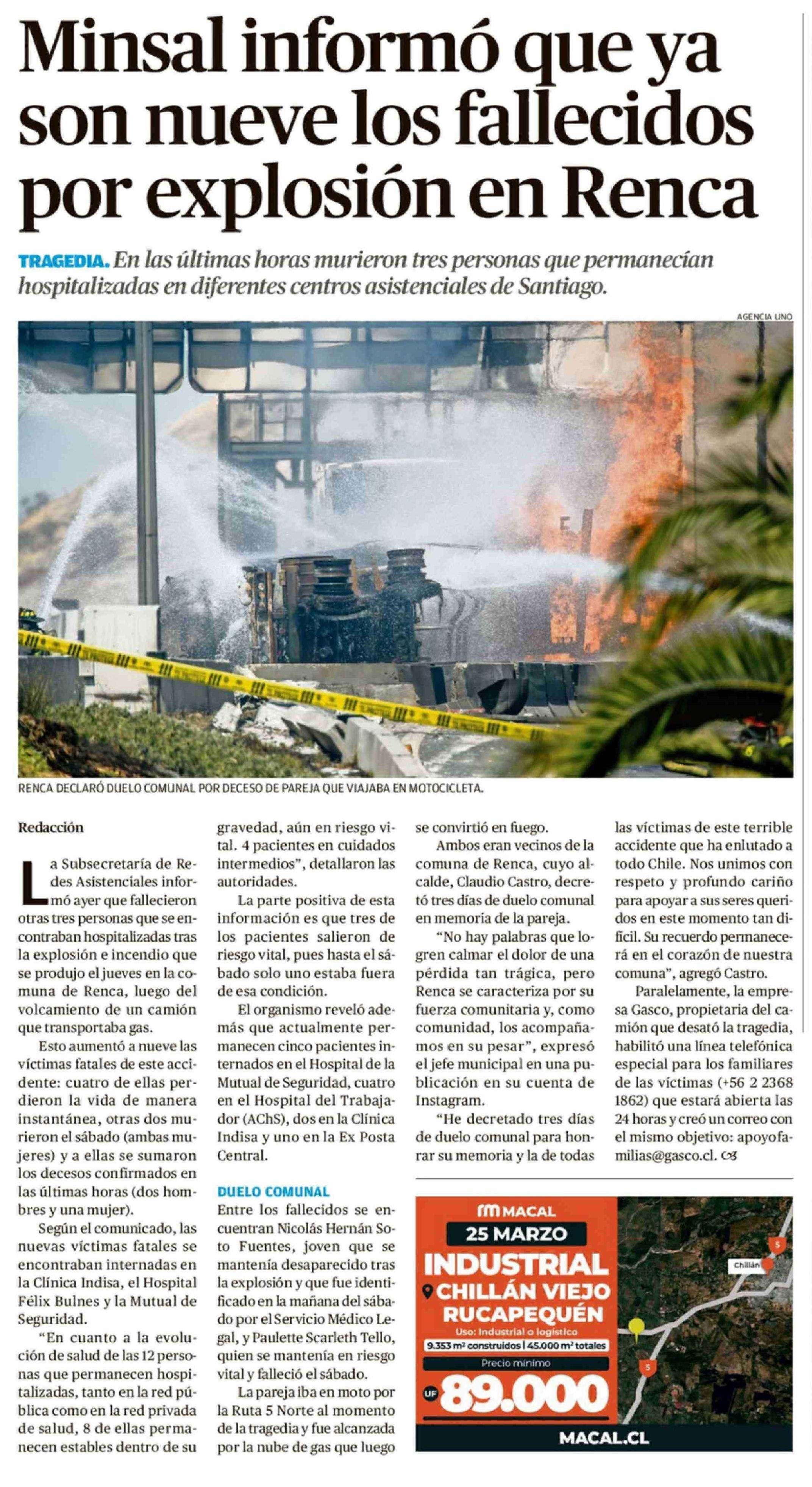 Minsal informó que ya son nueve los fallecidos por explosión en Renca