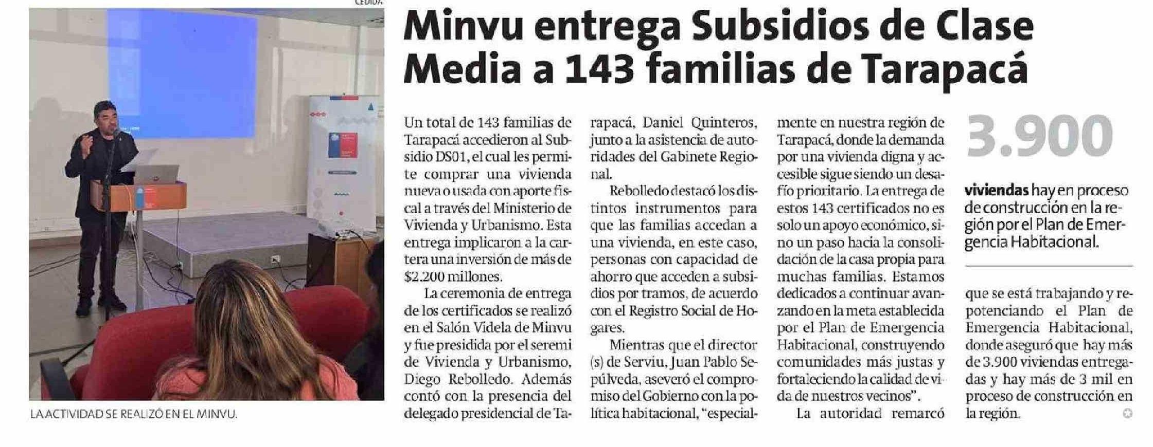 ' Minvu entrega Subsidios de Clase Media a 143 familias de Tarapacá