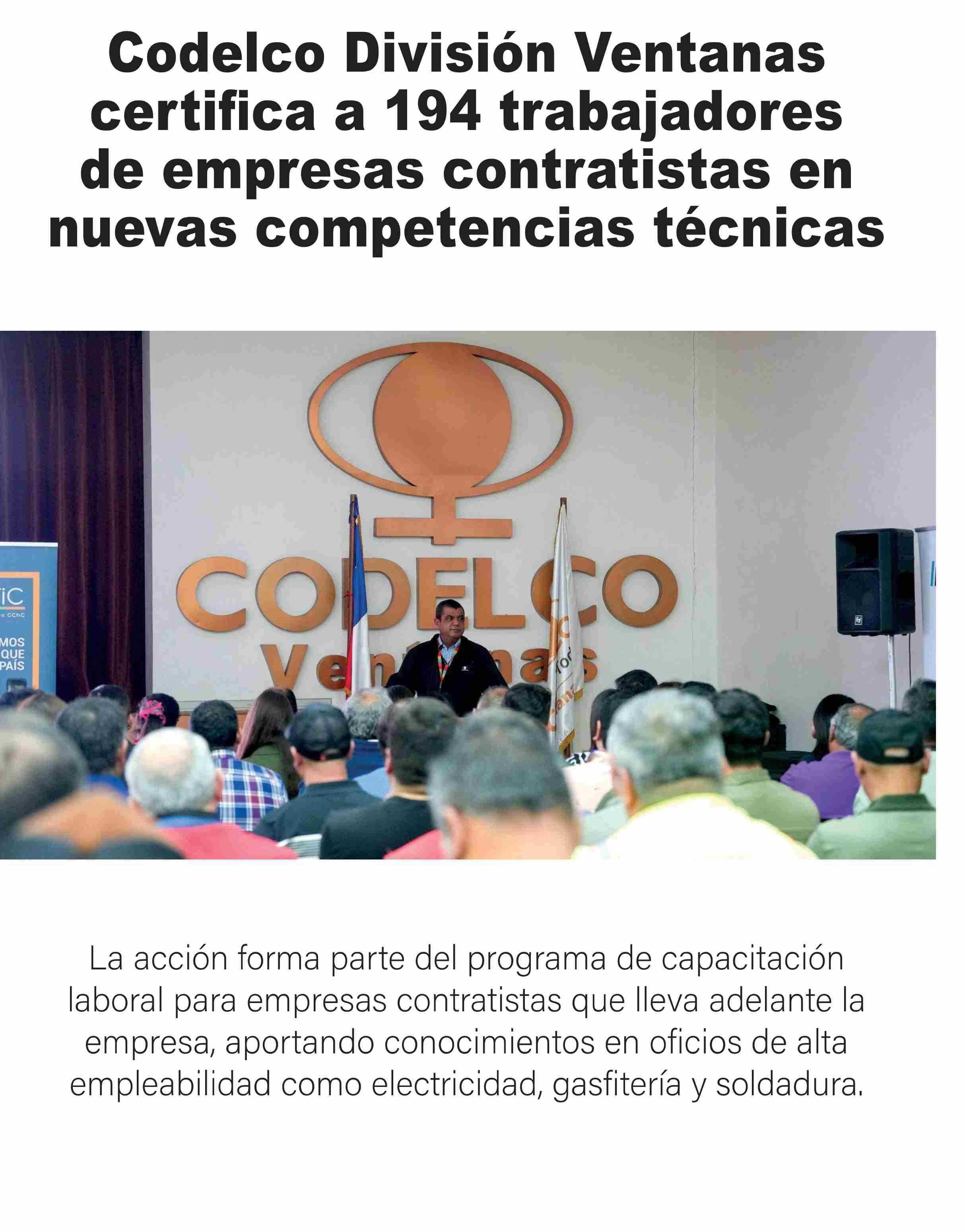 Título: Codelco División Ventanas certifica a 194 trabajadores de empresas contratistas en nuevas competencias técnicas