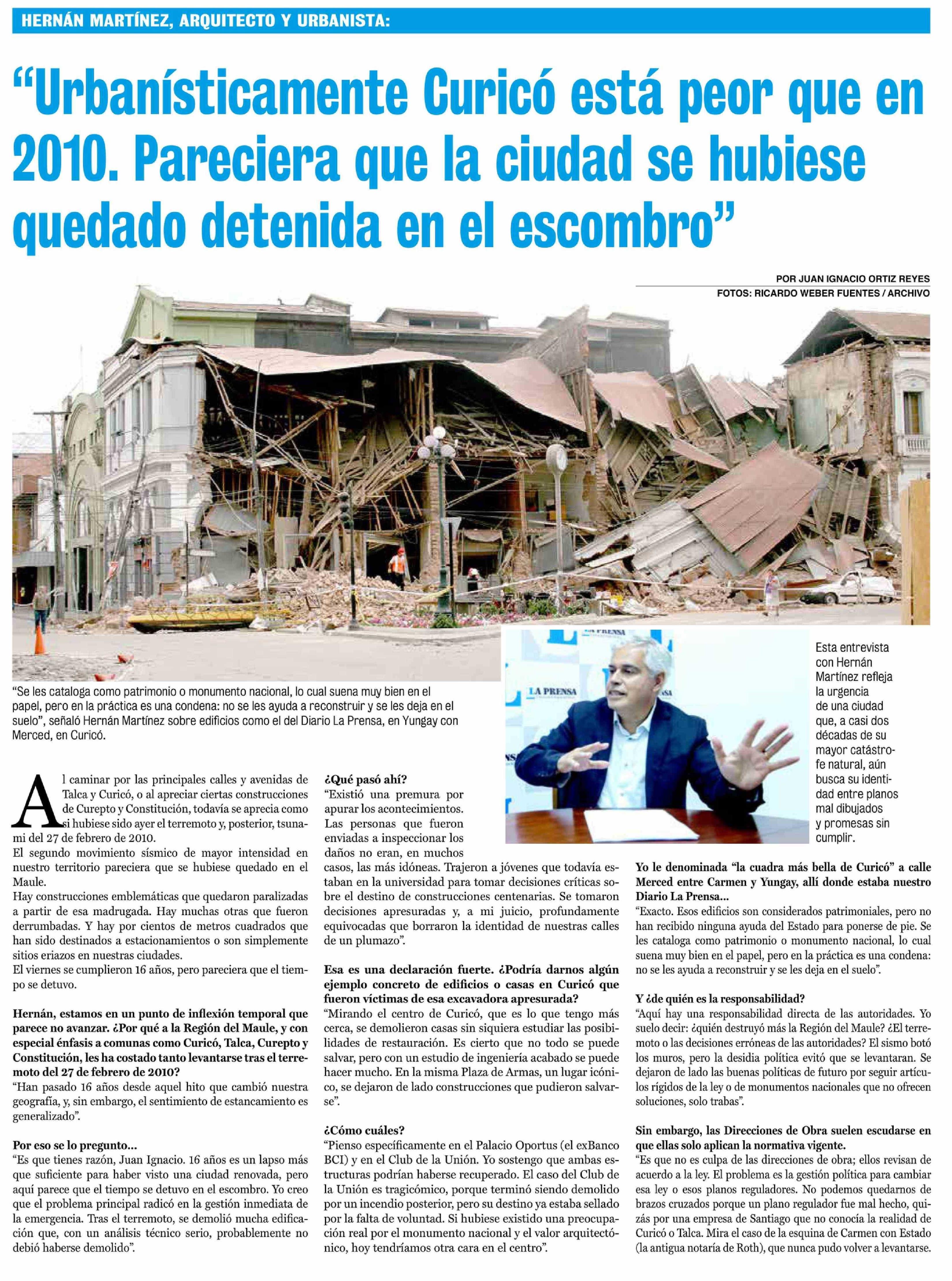 "Urbanisticamente Curicó está peor que en 2010. Pareciera que la ciudad se hubiese quedado detenida en el escombro"