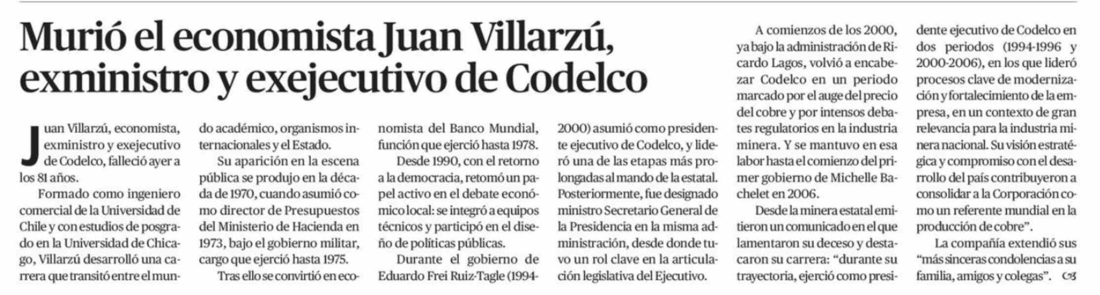 Murió el economista Juan Villarzú, exministro y exejecutivo de Codelco