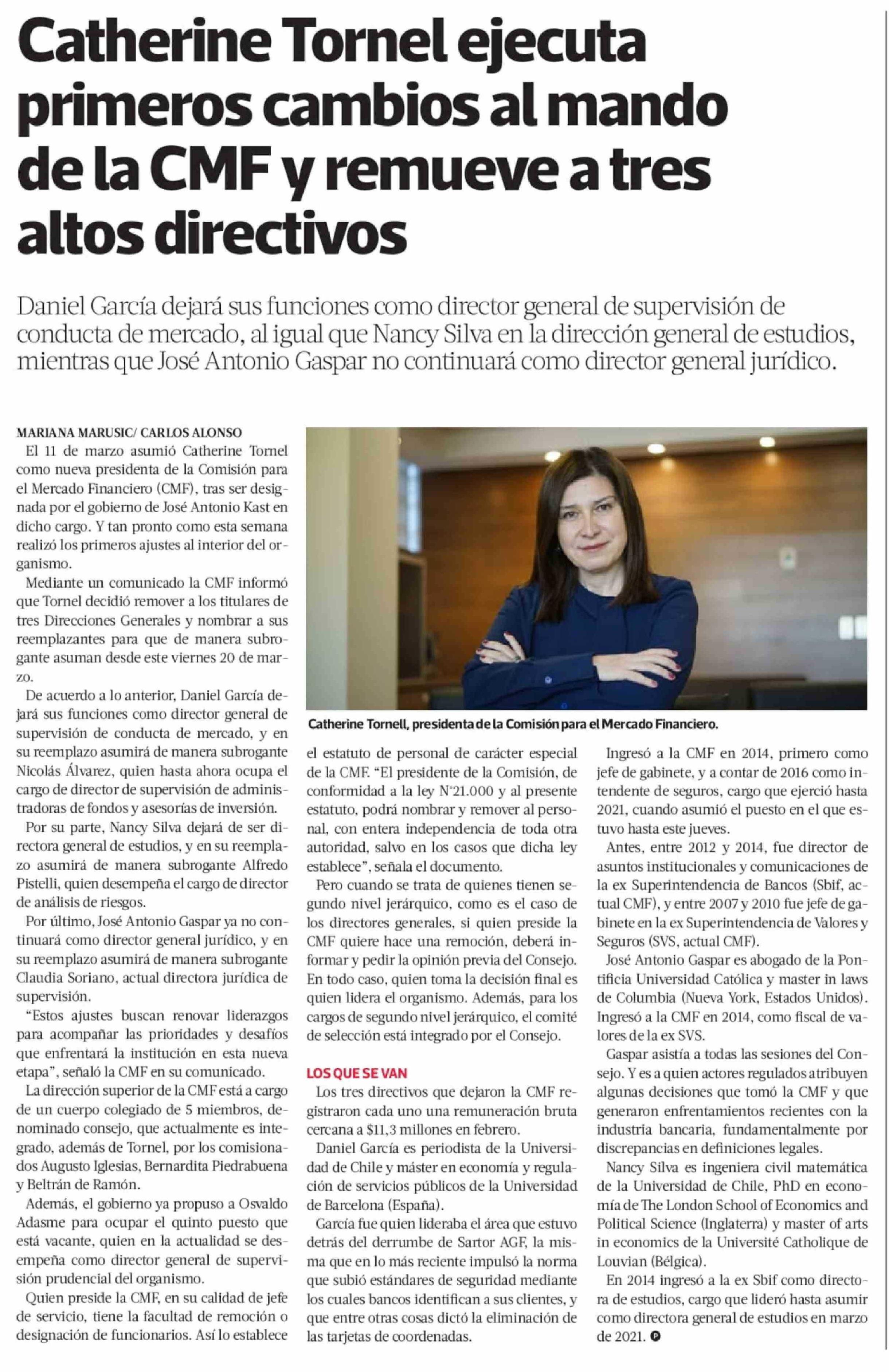 Catherine Tornel ejecuta primeros cambios al mando de la CMF y remueve a tres altos directivos
