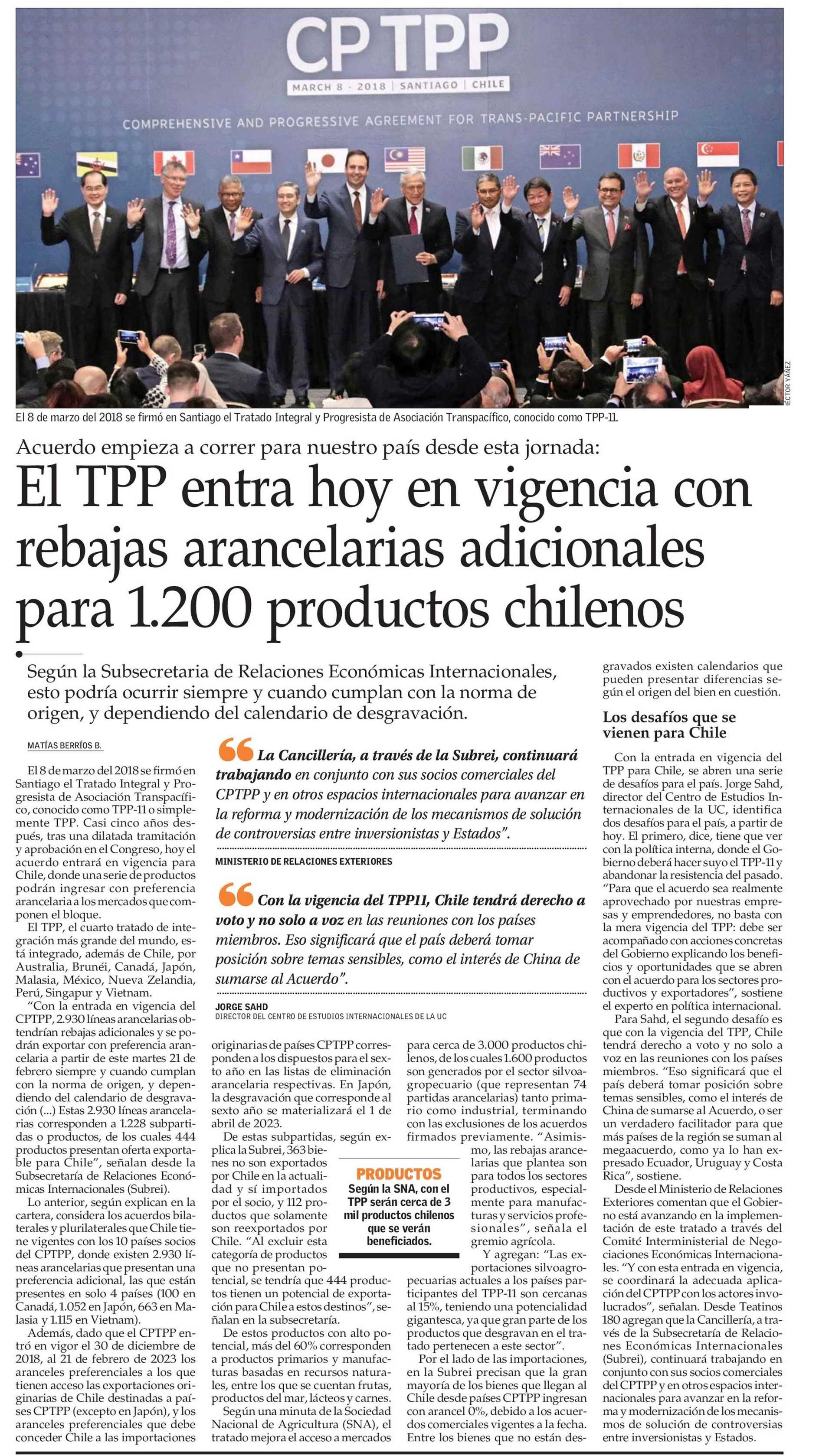 El TPP entra hoy en vigencia con rebajas arancelarias adicionales para 1. 200 productos chilenos