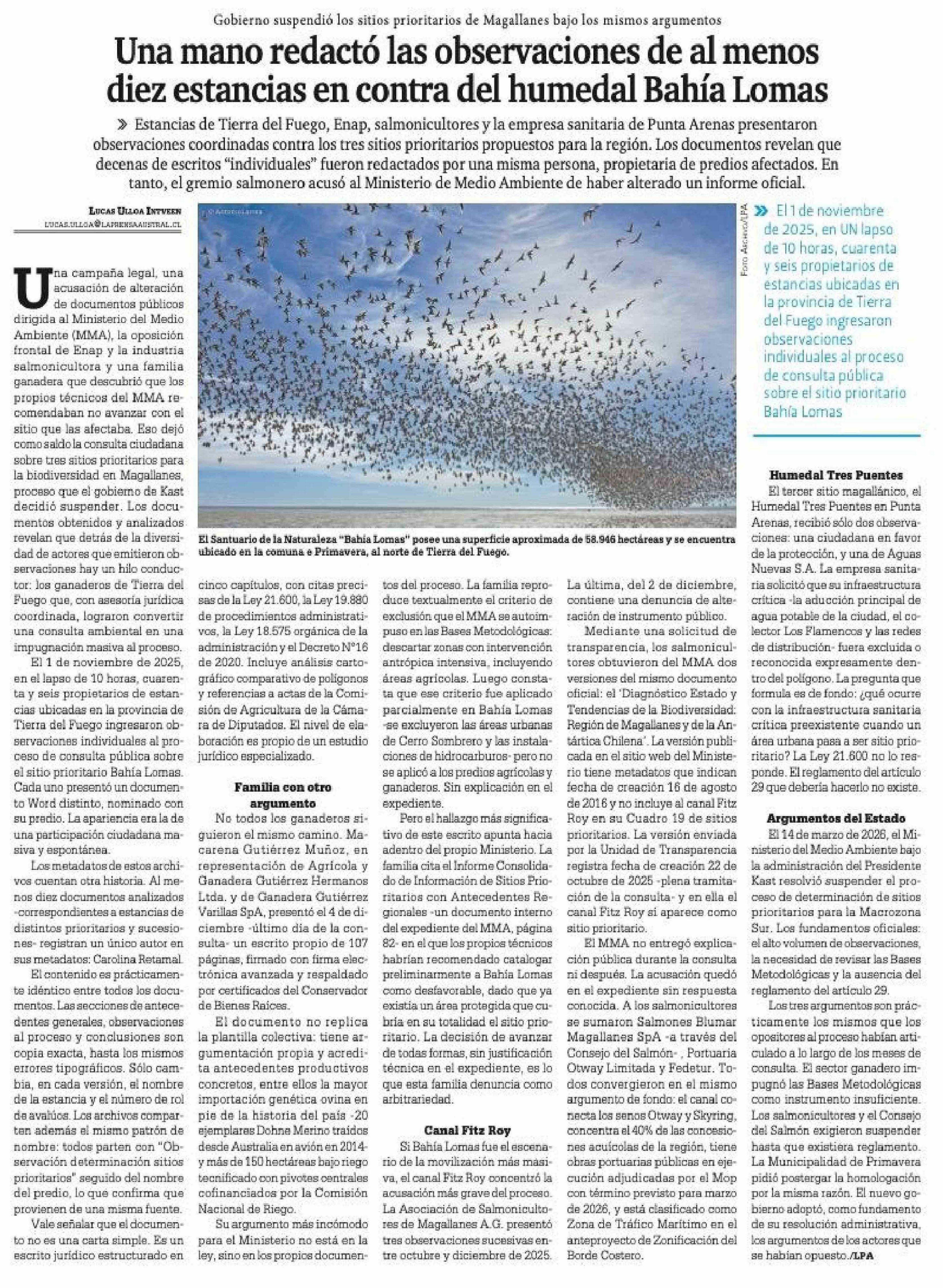 Una mano redactó las observaciones de al menos diez estancias en contra del humedal Bahía Lomas