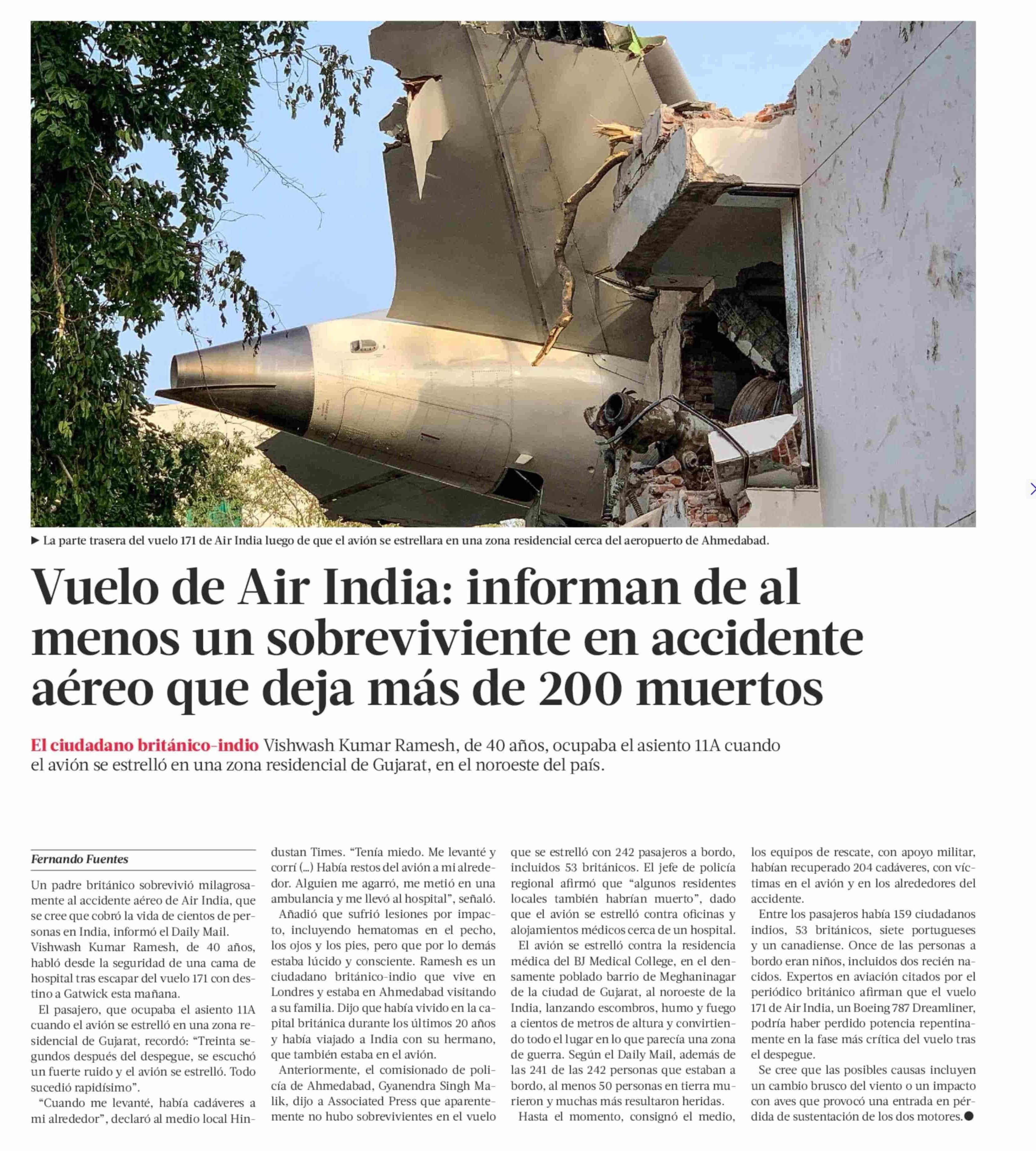 Vuelo de Air India: informan de al menos un sobreviviente en accidente aéreo que deja más de 200 muertos