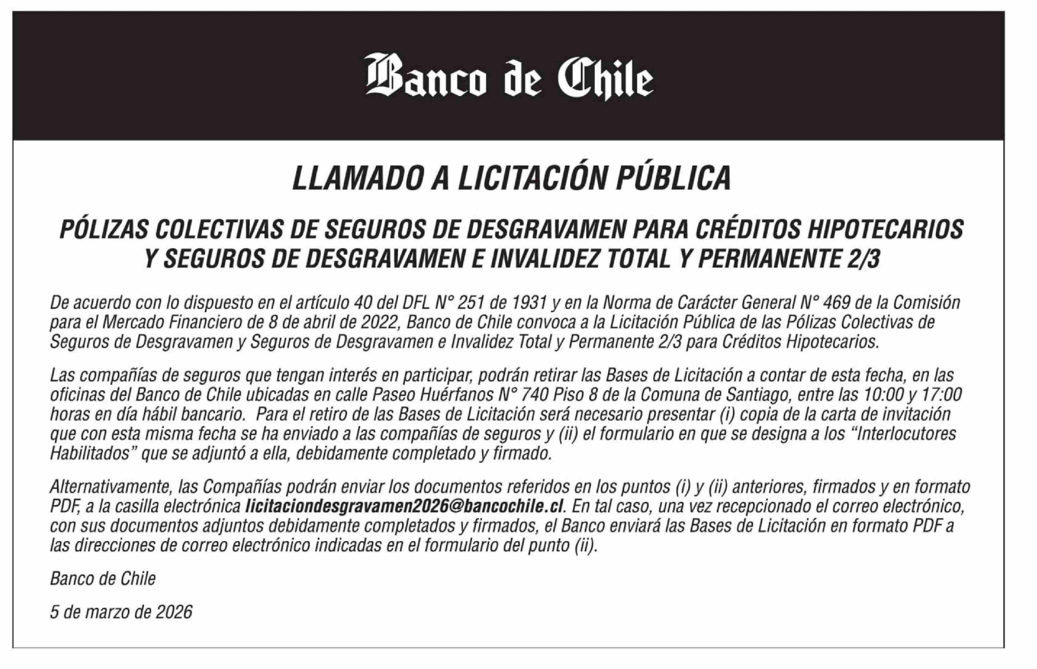 | Título: | AVISO LICITACIONES: PÓLIZAS COLECTIVAS DE SEGUROS DE DESGRAVAMEN PARA CRÉDITOS HIPOTECARIOS Y SEGUROS DE DESGRAVAMEN E INVALIDEZ TOTAL Y PERMANENTE 2/3 - BANCO DE CHILE |