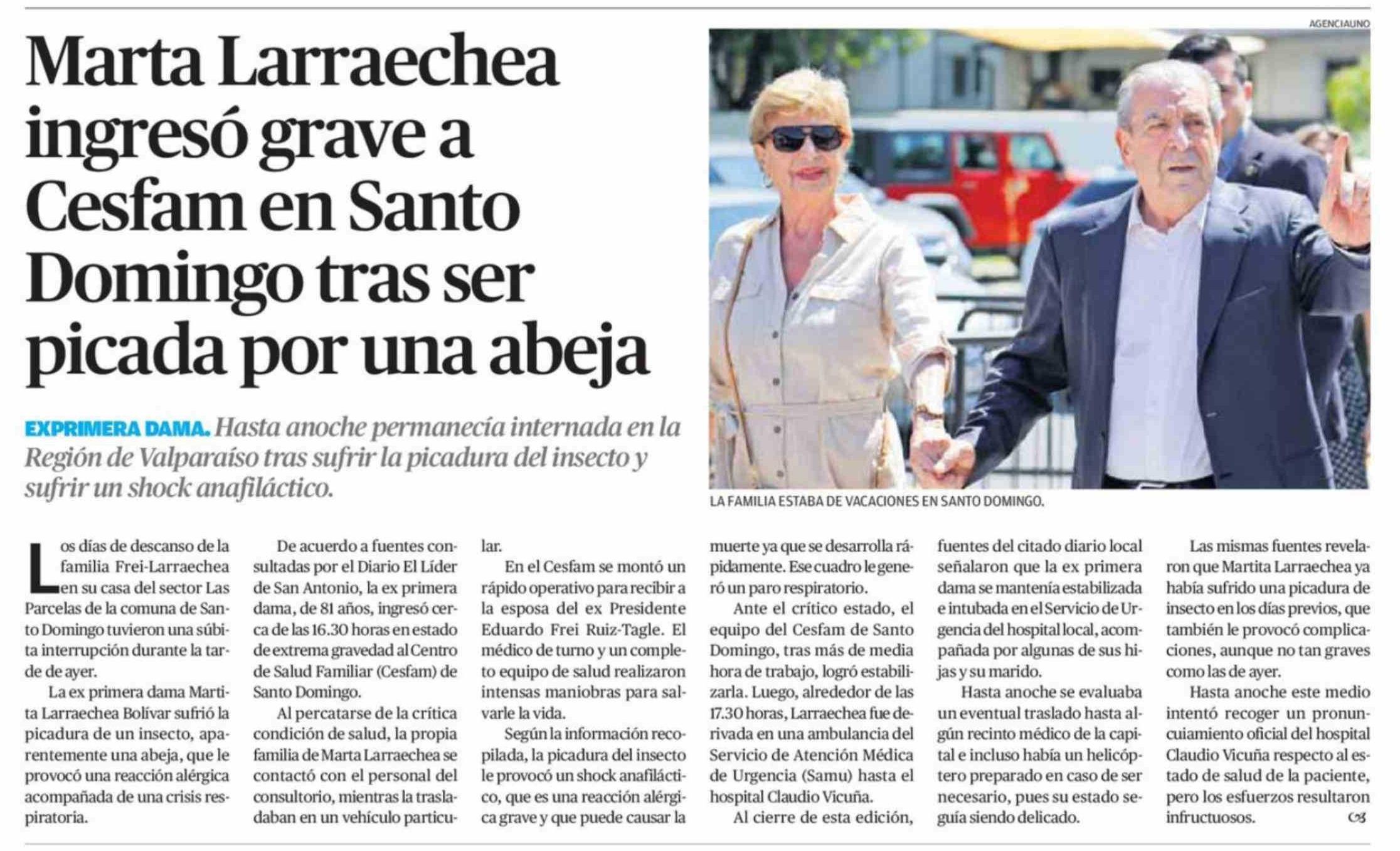 Marta Larraechea ingresó grave a Cesfam en Santo Domingo tras ser picada por una abeja