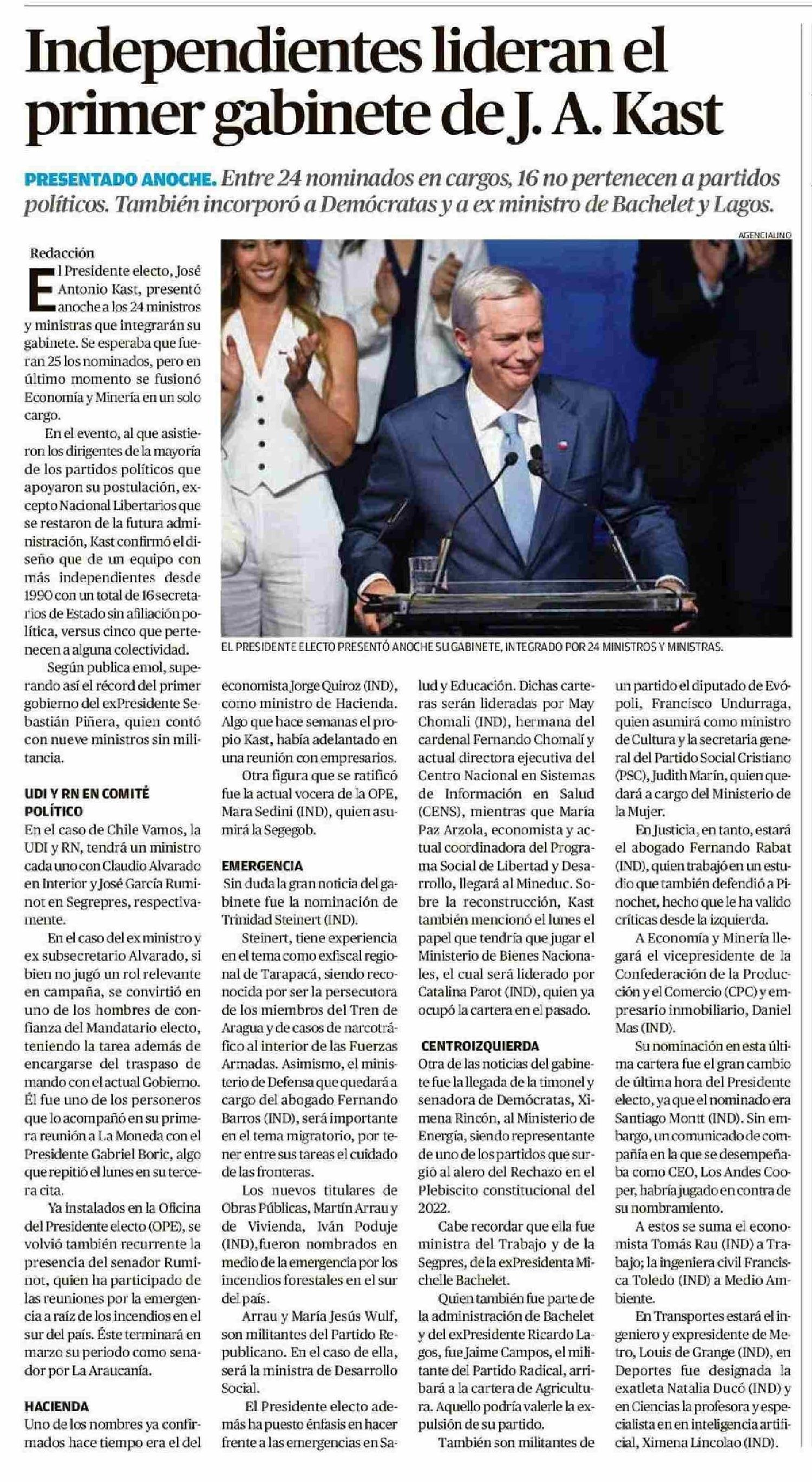 Independientes lideran el primer gabinete de J. A. Kast