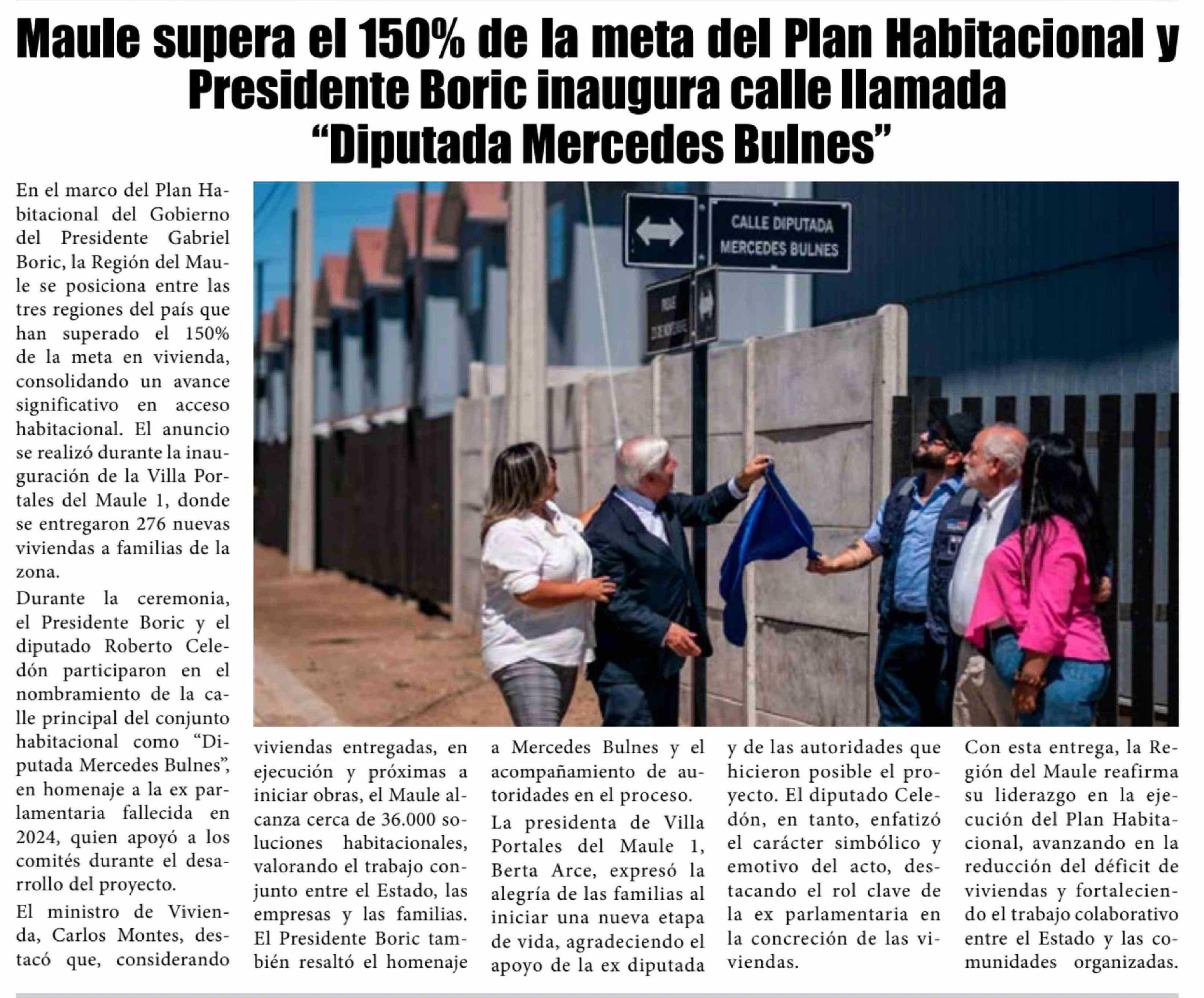 Maule supera el 150% de la meta del Plan Habitacional y Presidente Boric inaugura calle llamada "Diputada Mercedes Bulnes"