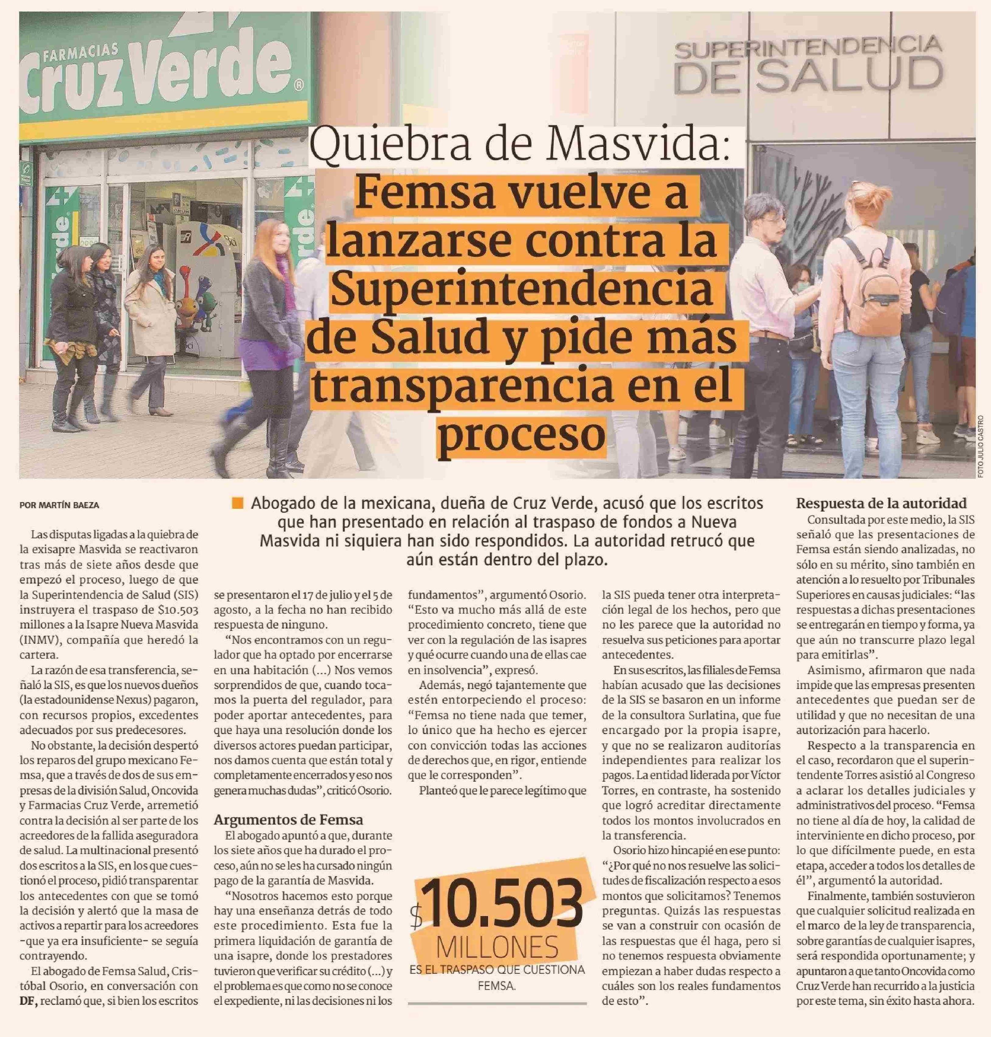 Quiebre de Masvida: Femsa vuelve a lanzarse contra la Superintendencia de Salud y pide mas transparencia en el proceso