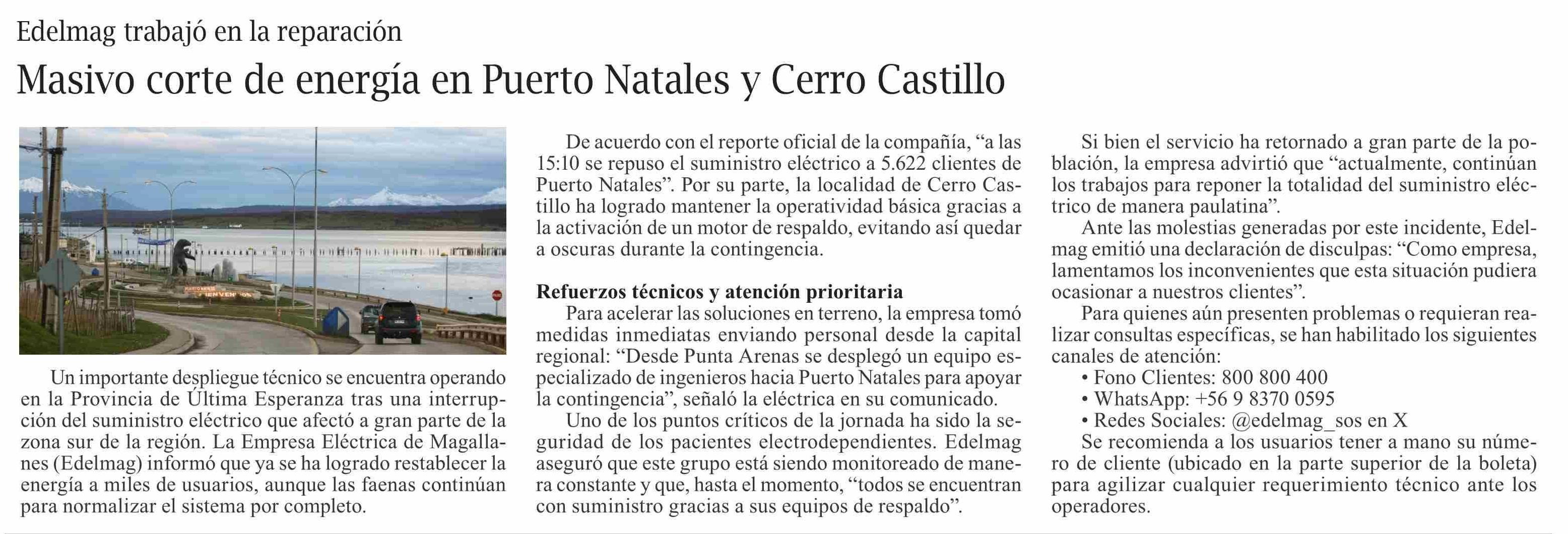 Masivo corte de energía en Puerto Natales y Cerro Castillo