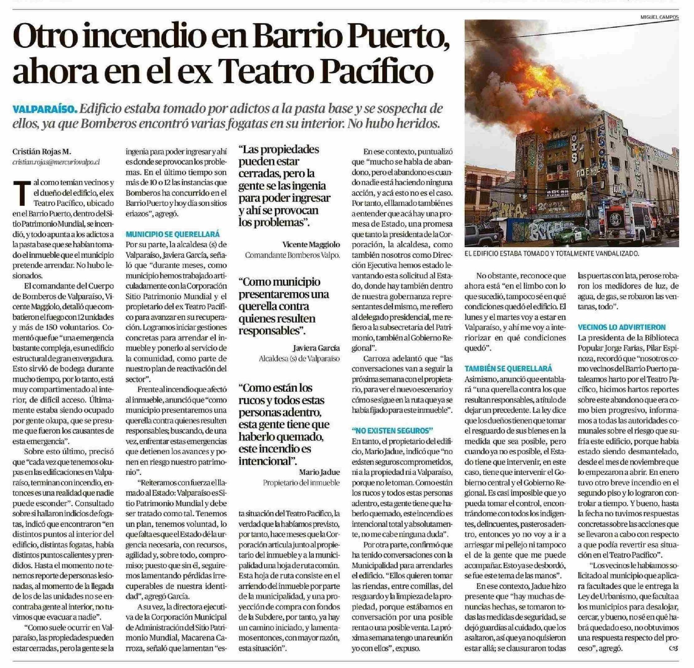 Otro incendio en Barrio Puerto, ahora en el ex Teatro Pacífico