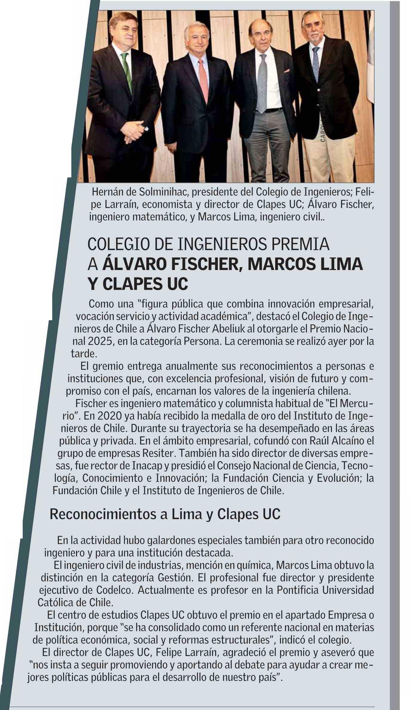 COLEGIO DE INGENIEROS PREMIA A ÁLVARO FISCHER, MARCOS LIMA Y CLAPES UC