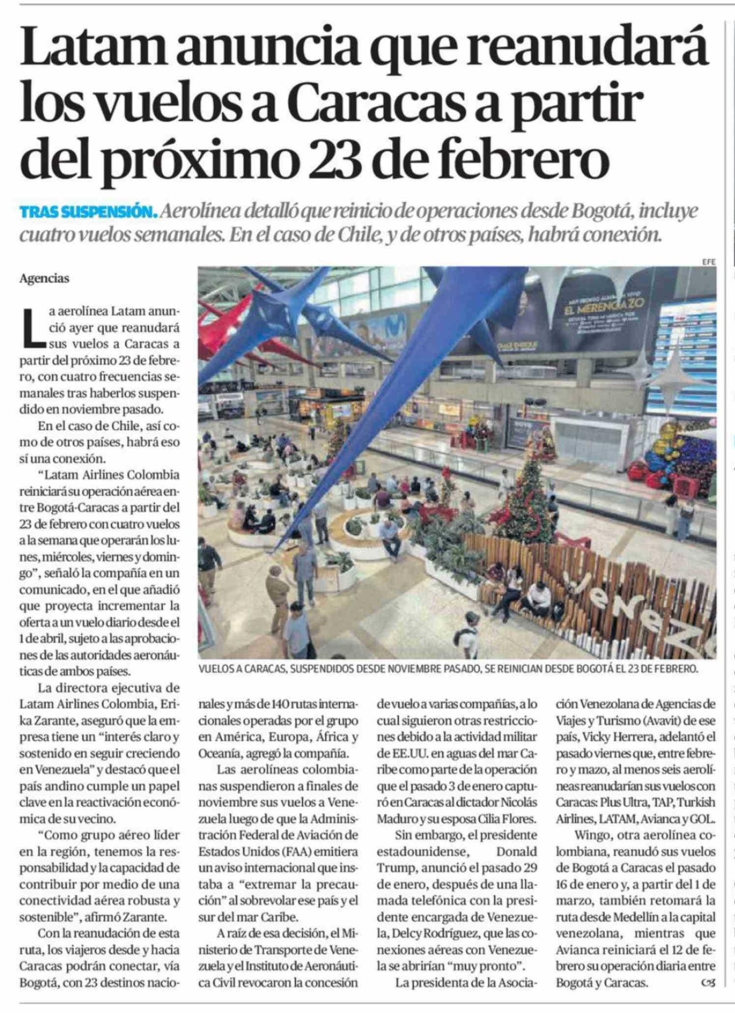 Latam anuncia que reanudará los vuelos a Caracas a partir del próximo 23 de febrero