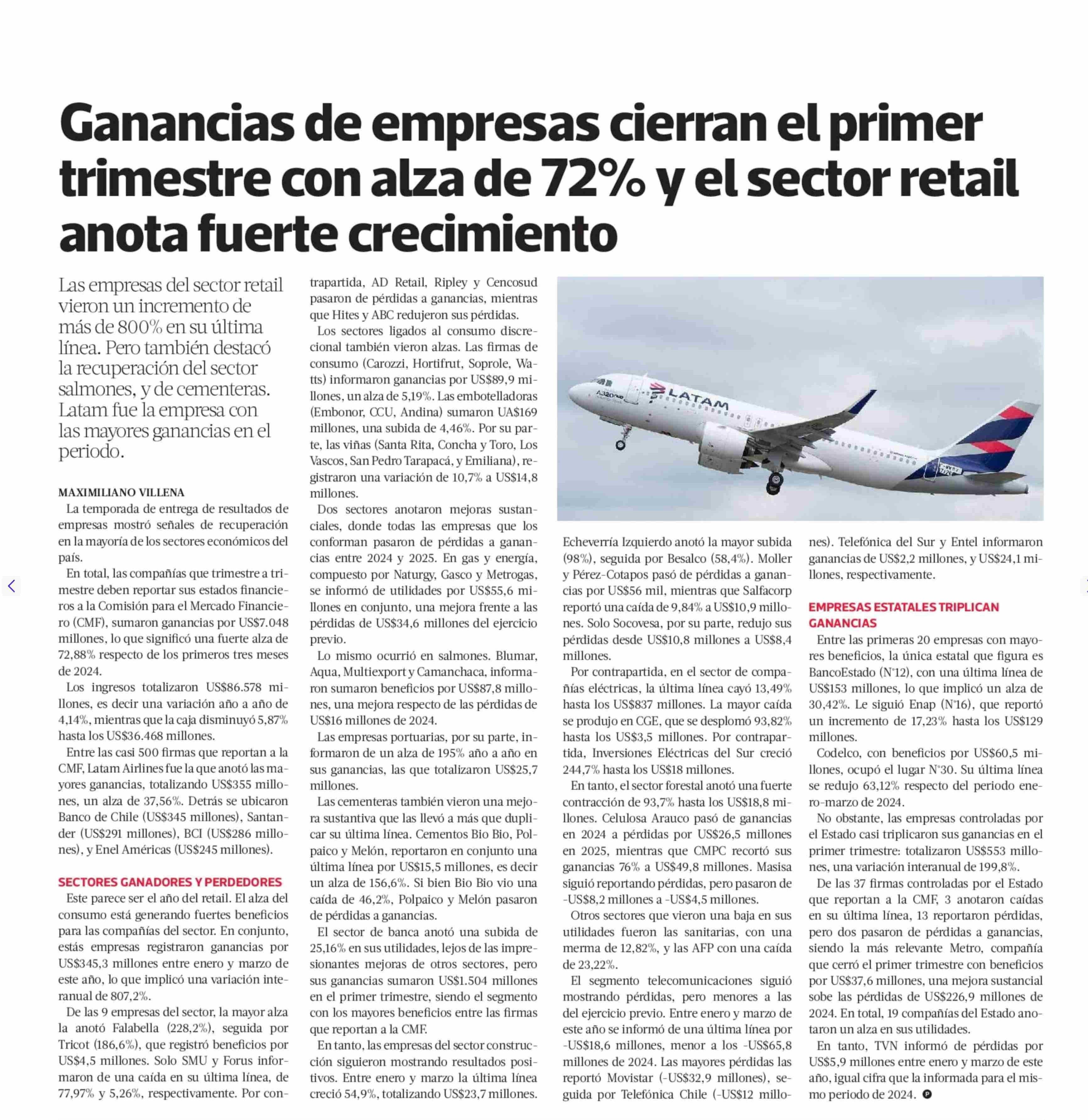 Ganancias de empresas cierran el primer trimestre con alza de 72% y el sector retail anota fuerte crecimiento