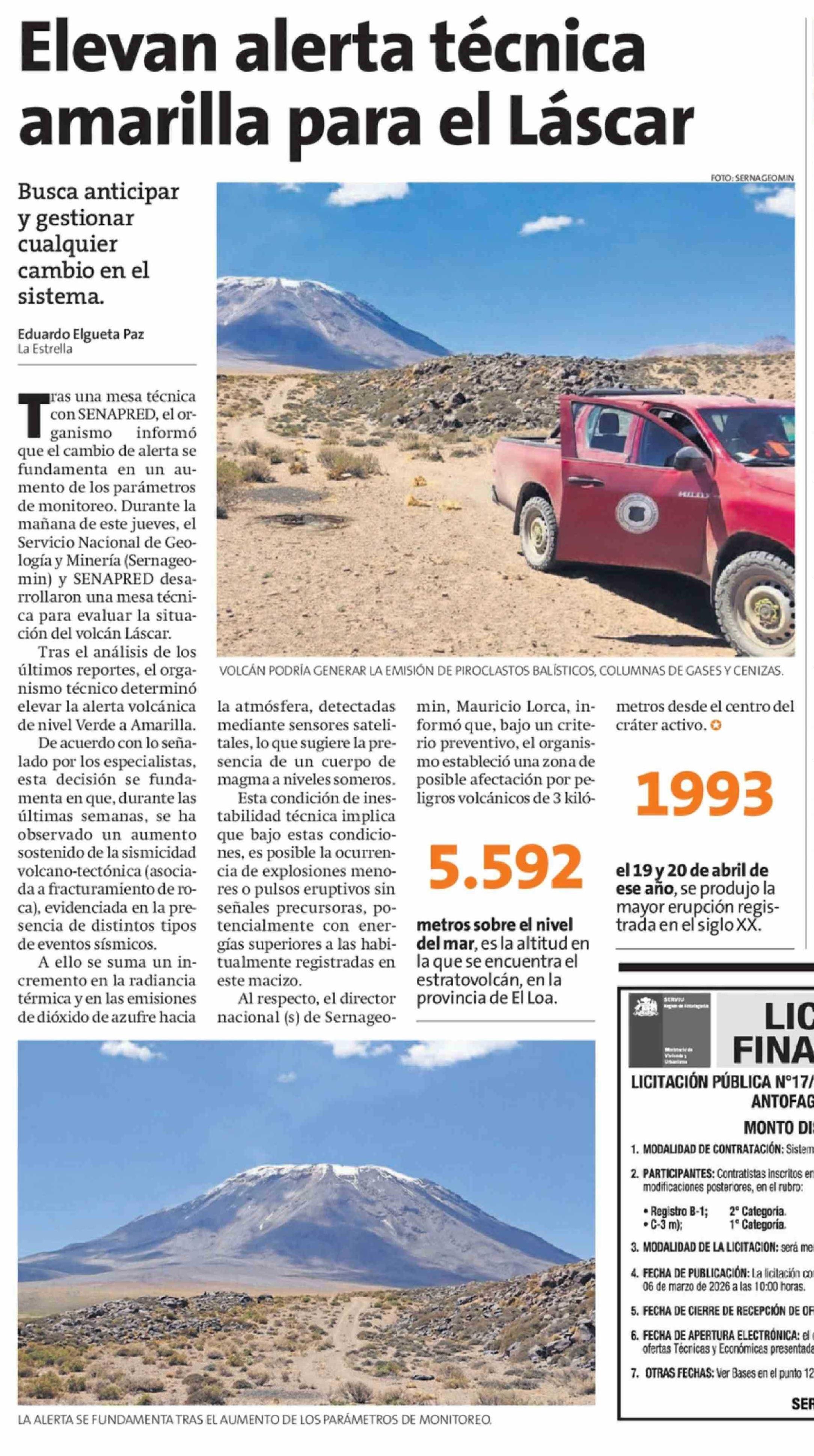 Elevan alerta técnica amarilla para el Láscar