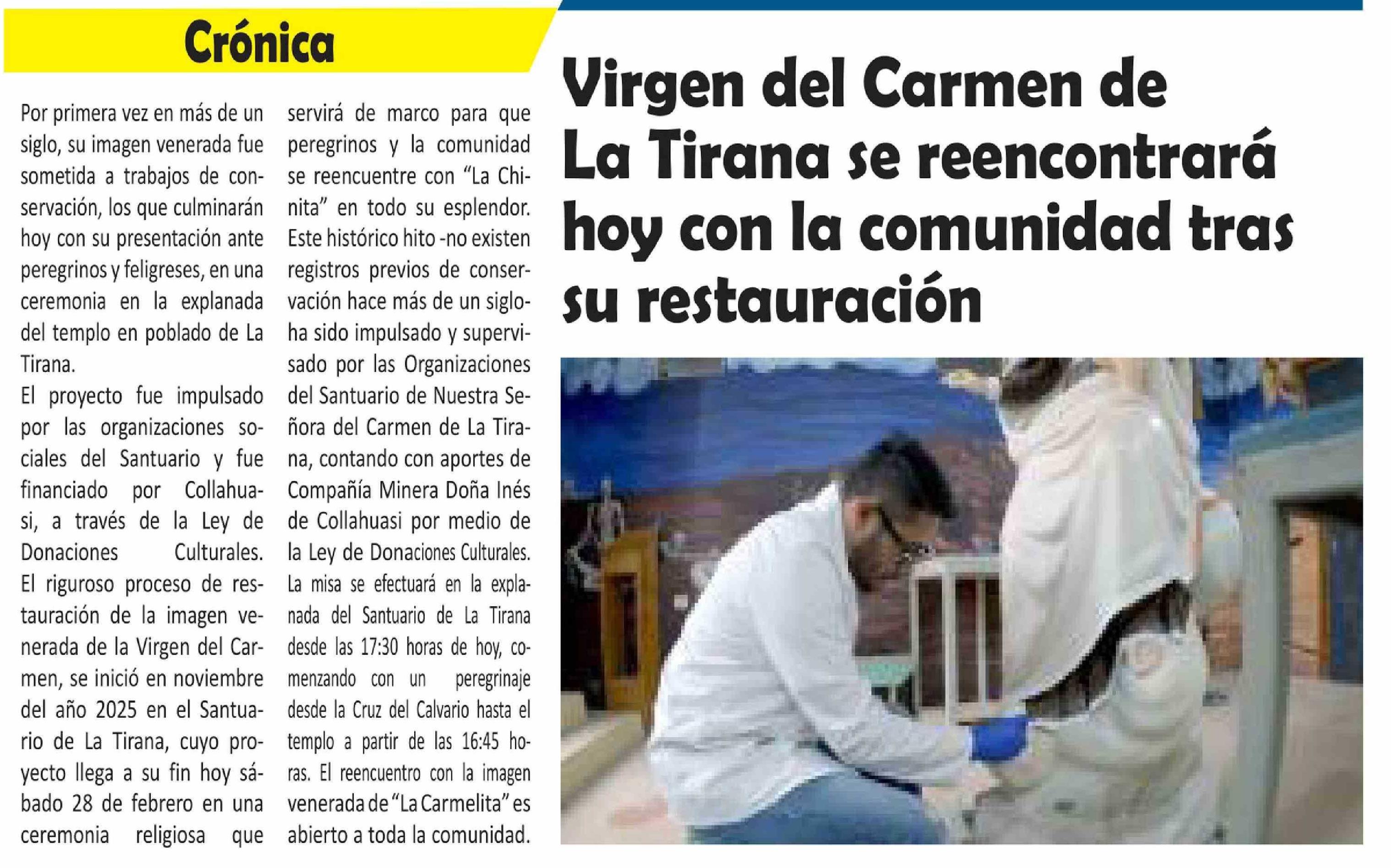 Virgen del Carmen de La Tirana se reencontrará hoy con la comunidad tras su restauración