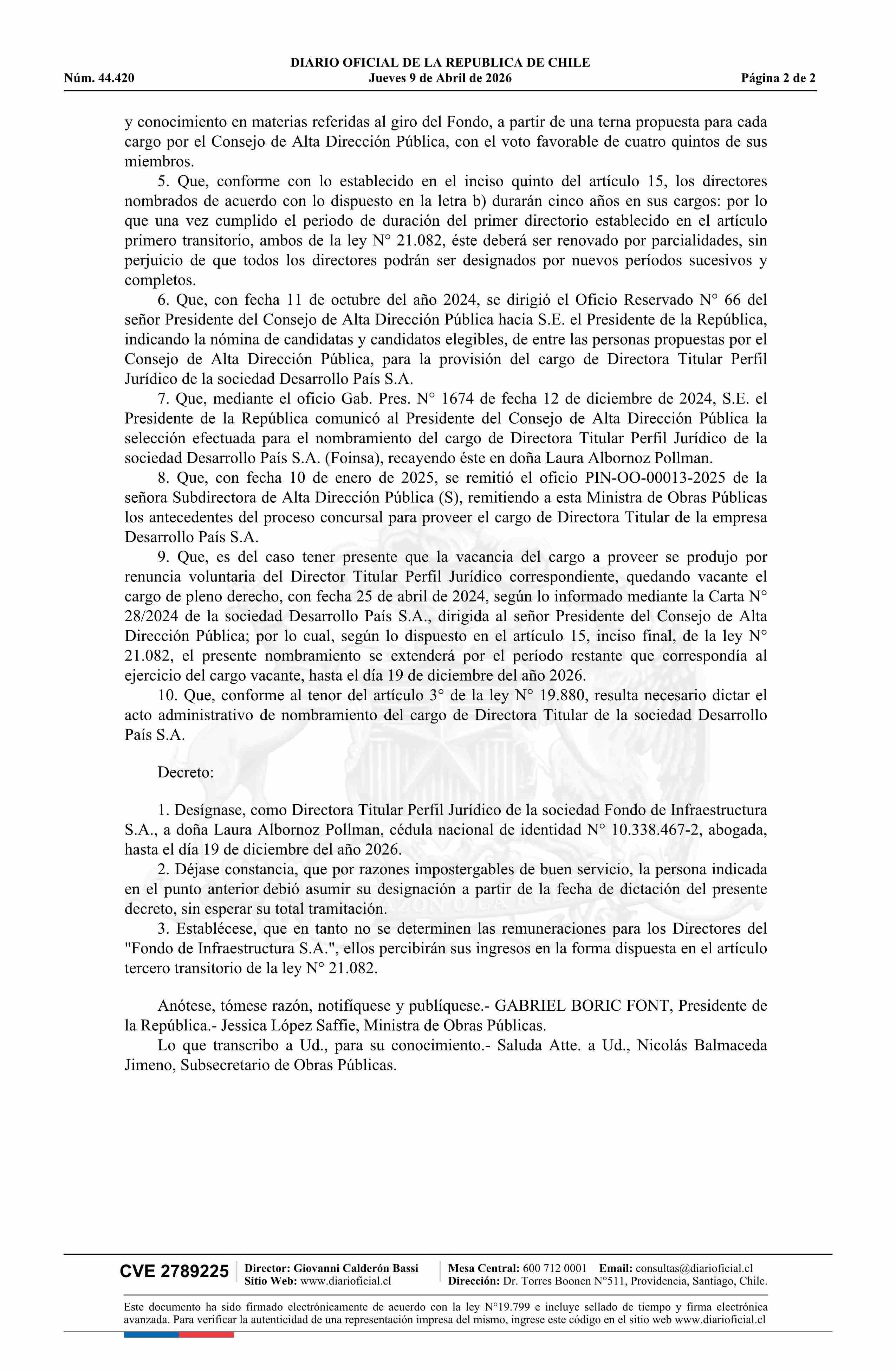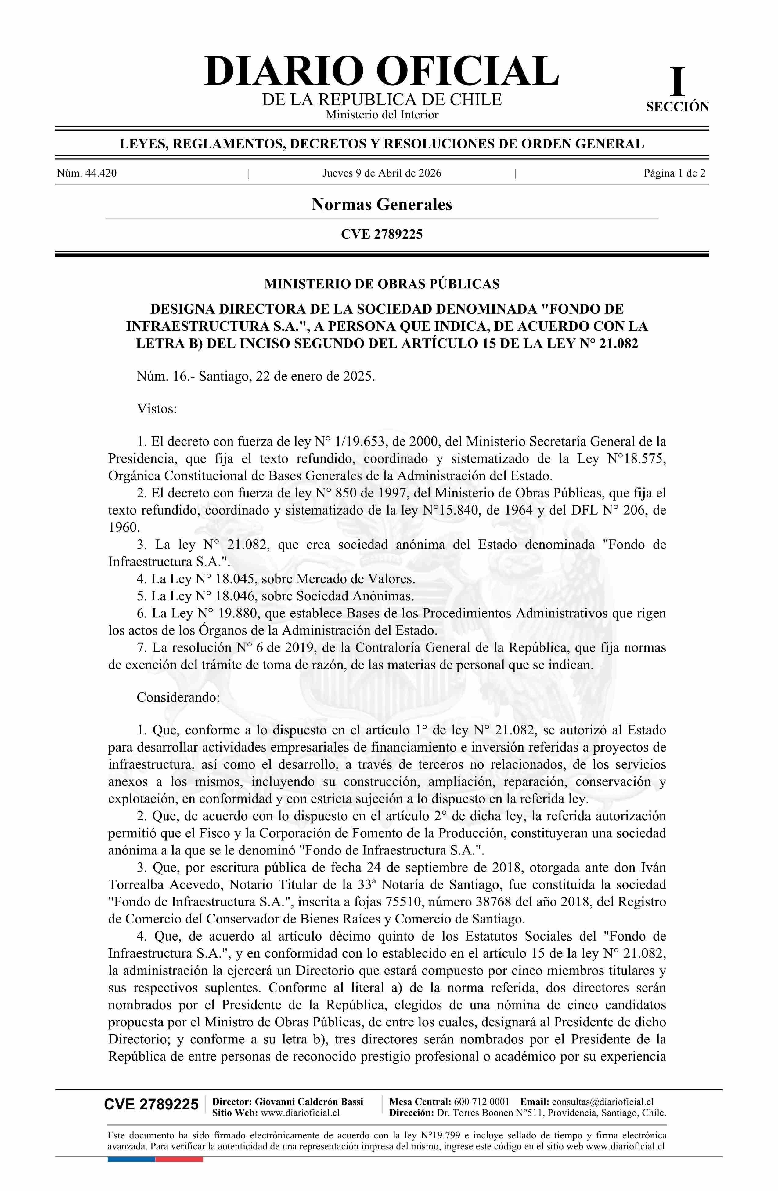 | Título: | Decreto número 16, de 2025.- Designa a doña Laura Albornoz Pollman como Directora de la sociedad denominada Fondo de Infraestructura S.A., de acuerdo con la letra b) del inciso segundo del artículo 15 de la ley N° 21.082 |