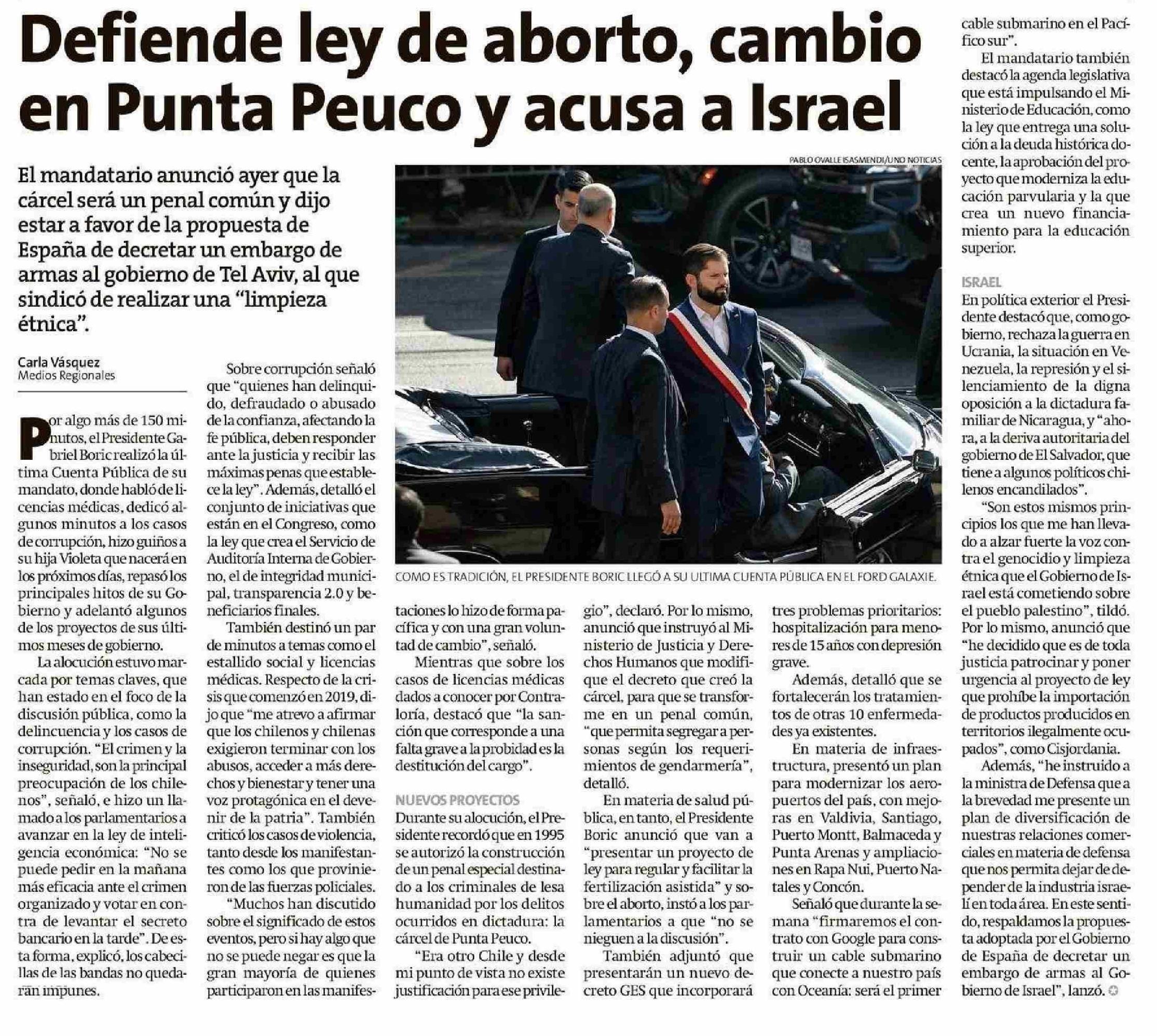 Defiende ley de aborto cambio en Punta Peuco y acusa a Israel