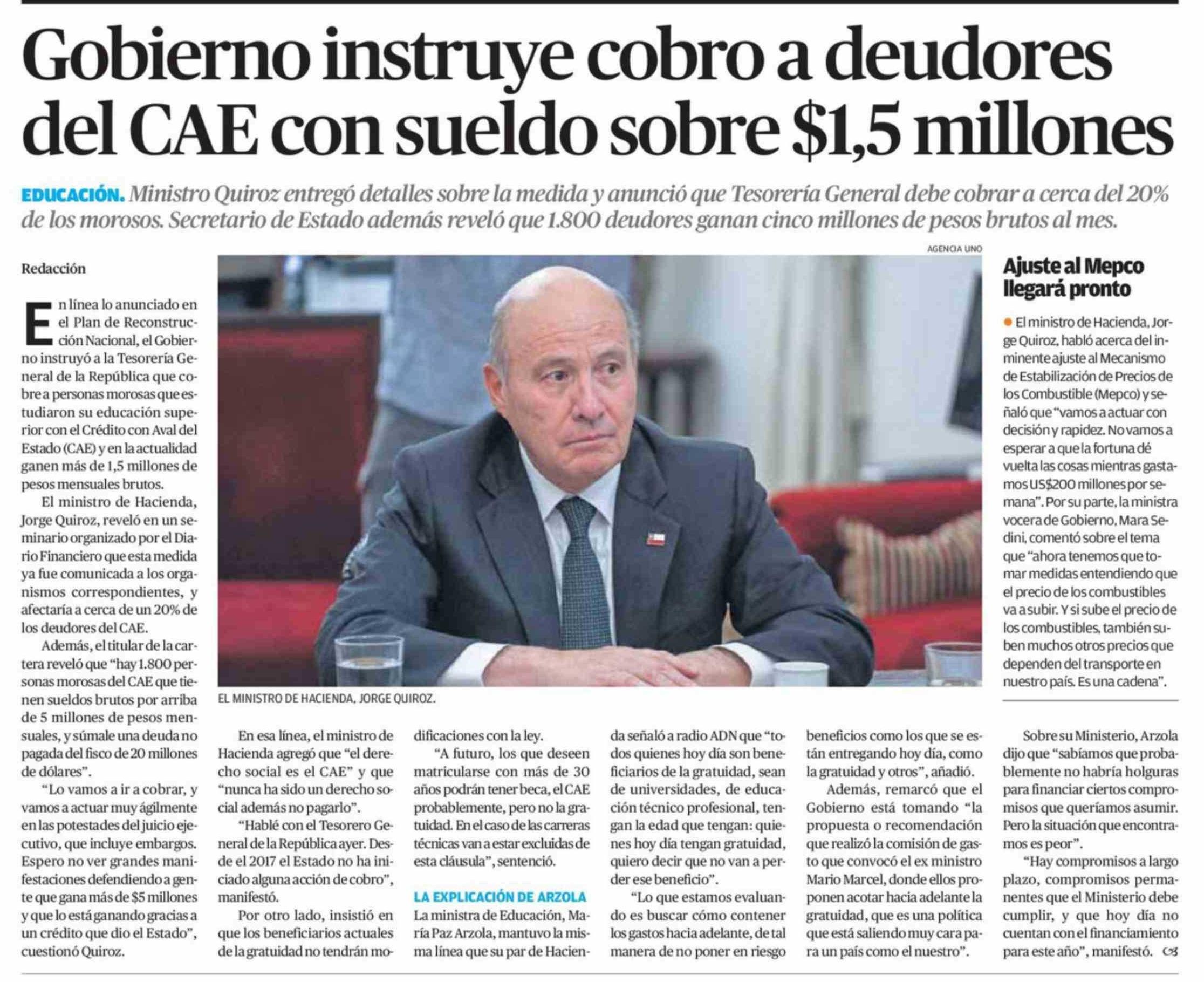 Gobierno instruye cobro a deudores del CAE con sueldo sobre $1,5 millones
