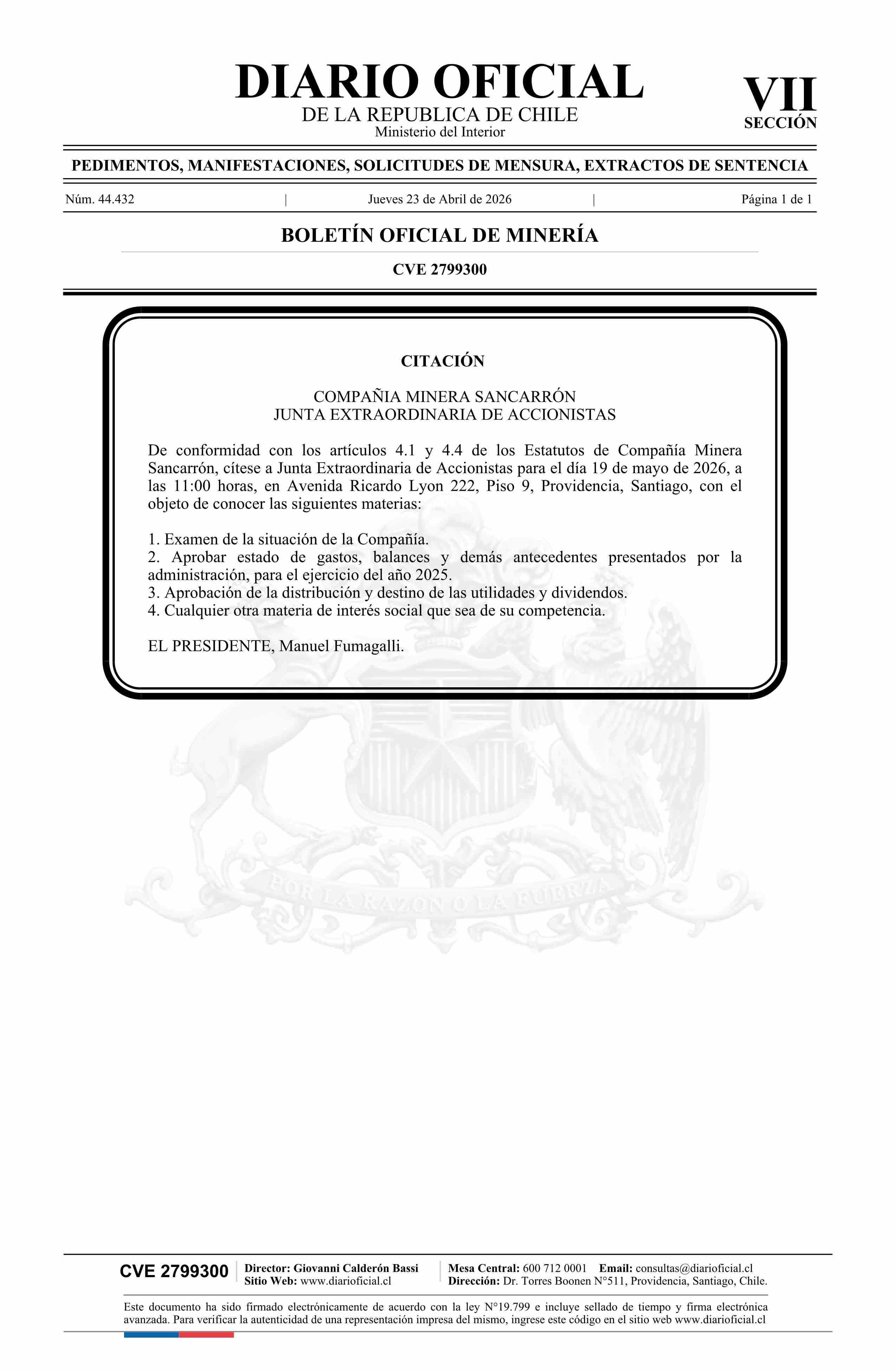 DIARIO OFICIAL CHILE - BOLETÍN OFICIAL DE MINERÍA (DIARIO OFICIAL CHILE – BOM – CITACIONES A JUNTA)