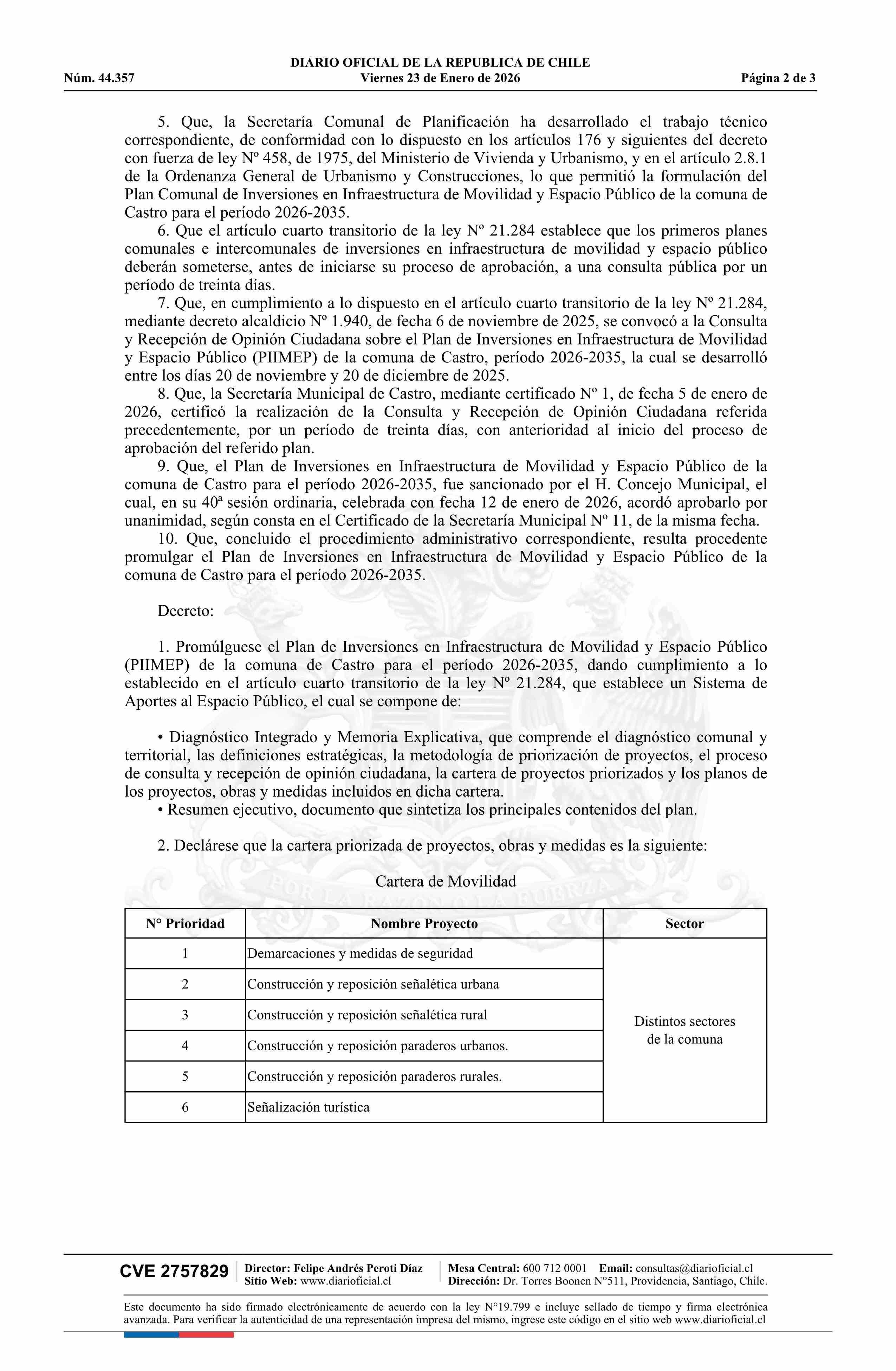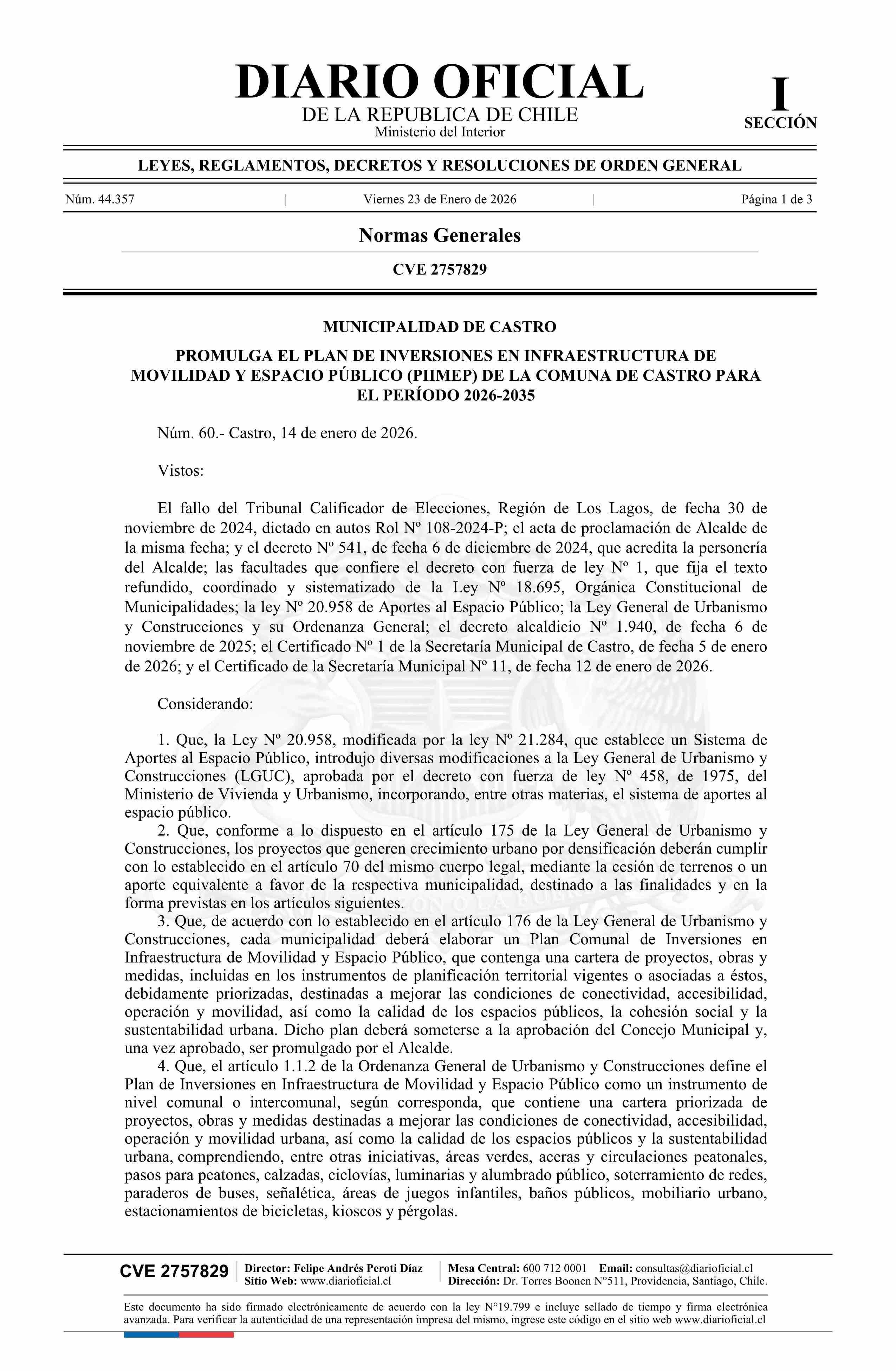 | Título: | Decreto alcaldicio número 60, de 2026.- Promulga el Plan de Inversiones en Infraestructura de Movilidad y Espacio Público de la comuna de Castro para el período 2026-2035 |