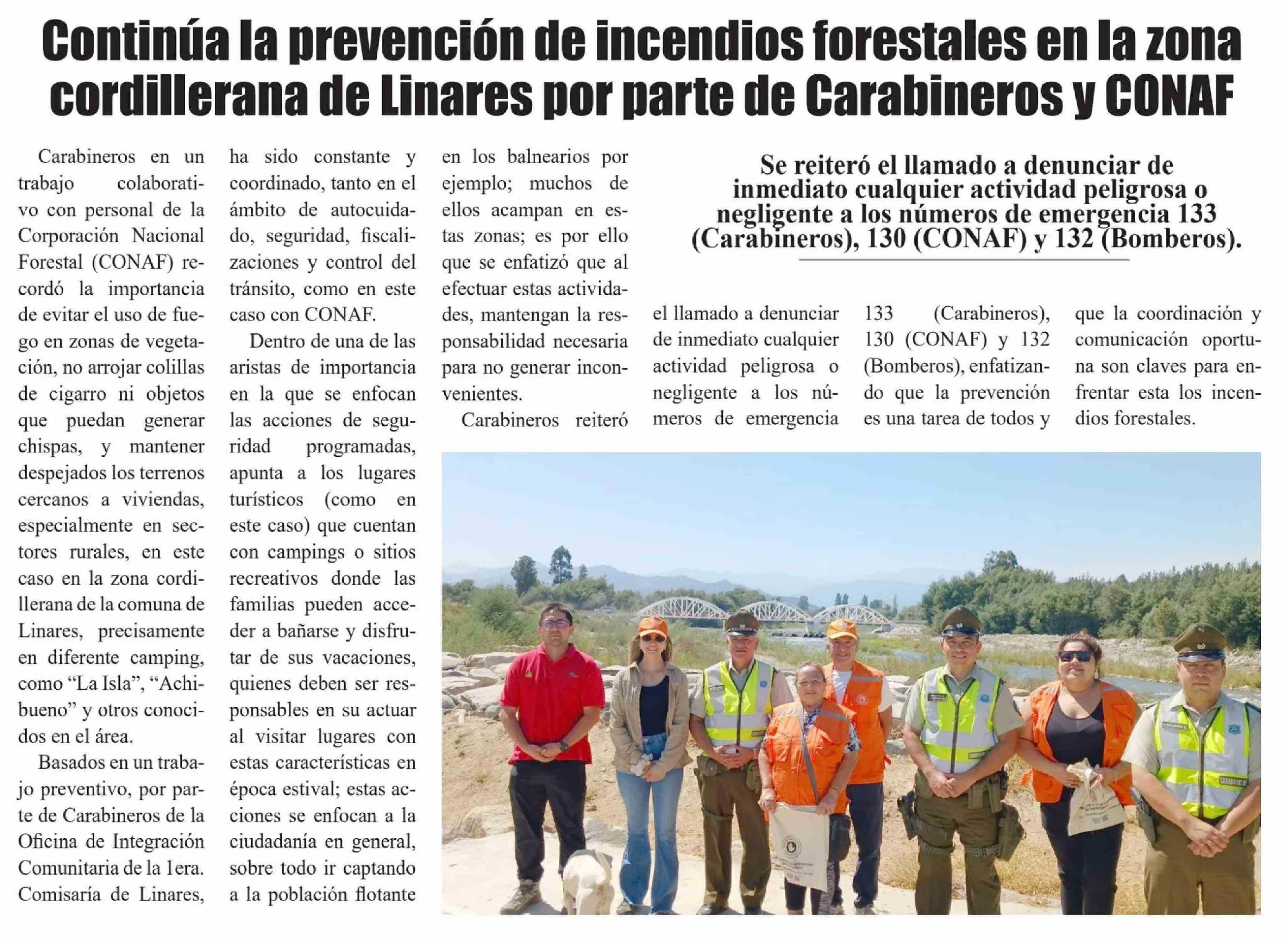Continúa la prevención de incendios forestales en la zona cordillerana de Linares por parte de Carabineros y CONAF