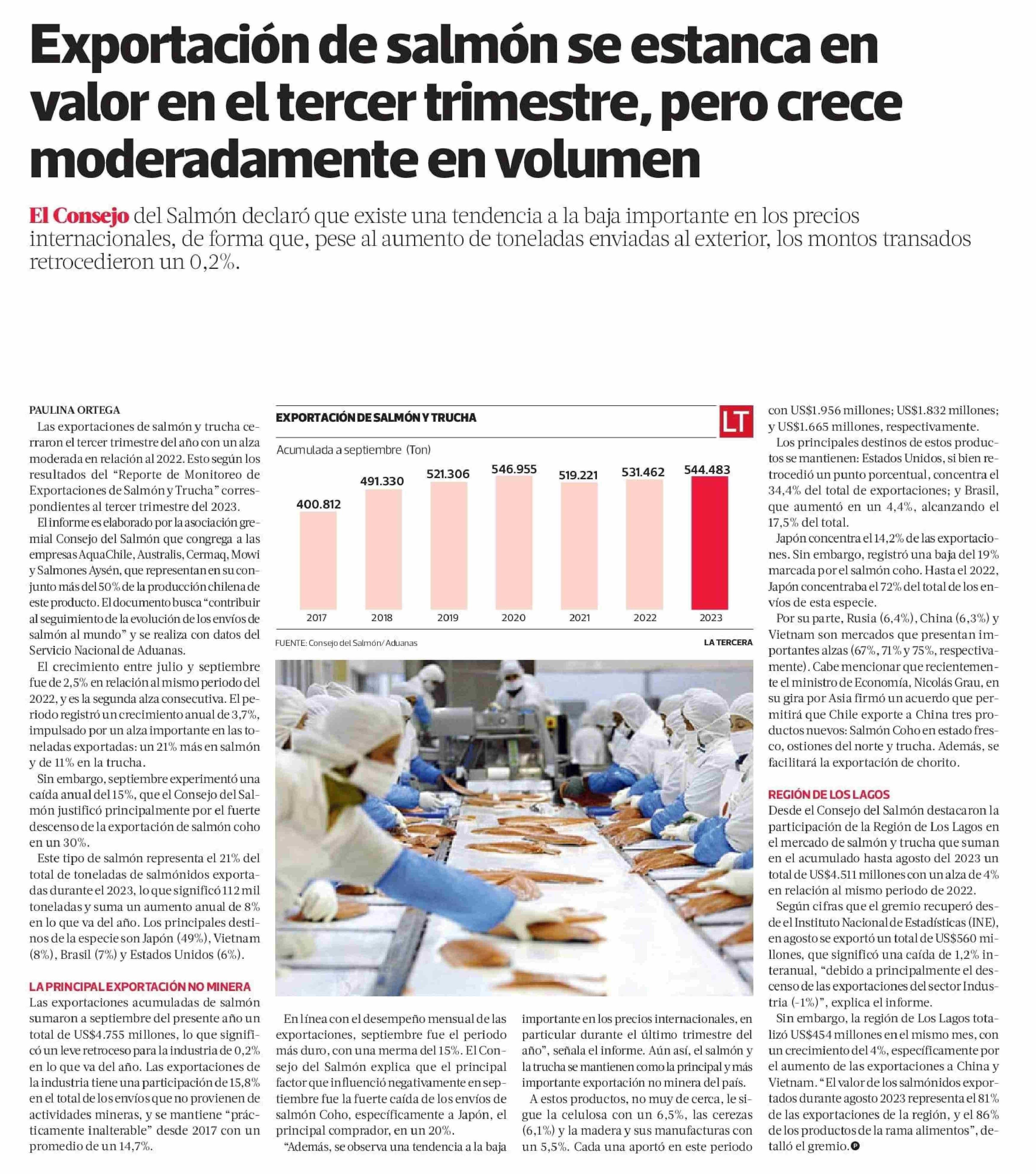 Exportación de salmón se estanca en valor en el tercer trimestre, pero crece moderadamente en volumen